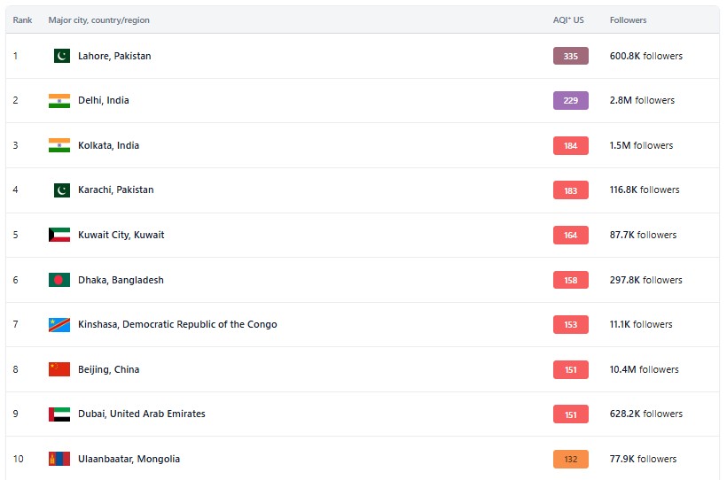 আইকিউএয়ারের দেওয়া তথ্যে দেখা যায়, দূষিত শহরের তালিকায় প্রথম স্থানে রয়েছে পাকিস্তানের লাহোর, স্কোর ৩৩৫। দ্বিতীয় অবস্থানে রয়েছে ভারতের দিল্লি, বায়ুর মানের স্কোর ২২৯, তৃতীয় স্থানে রয়েছে কলকাতা, স্কোর ১৮৪। ১৮৩ স্কোর নিয়ে চতুর্থ অবস্থানে রয়েছে পাকিস্তানের করাচি এবং ১৬৪ স্কোর নিয়ে পঞ্চম অবস্থানে কুয়েতের কুয়েত সিটি।