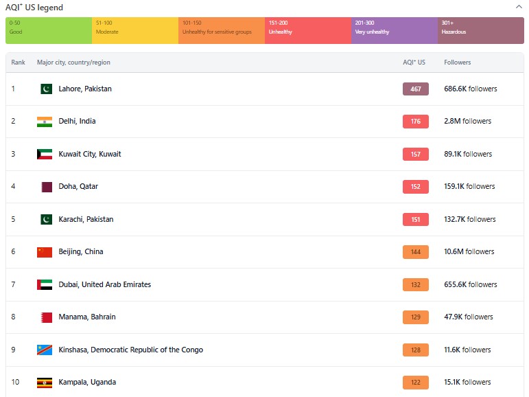 আইকিউএয়ারের দেওয়া তথ্যে দেখা যায়, দূষিত শহরের তালিকায় প্রথম স্থানে রয়েছে পাকিস্তানের লাহোর, স্কোর ৪৬৭। দ্বিতীয় অবস্থানে রয়েছে ভারতের দিল্লি, বায়ুর মানের স্কোর ১৭৬, তৃতীয় স্থানে রয়েছে কুয়েতের কুয়েত সিটি, স্কোর ১৫৭। একইসঙ্গে ১৫২ ও ১৫১ স্কোর নিয়ে যথাক্রমে চতুর্থ ও পঞ্চম অবস্থানে রয়েছে কাতারের দোহা ও পাকিস্তানের করাচি শহর।