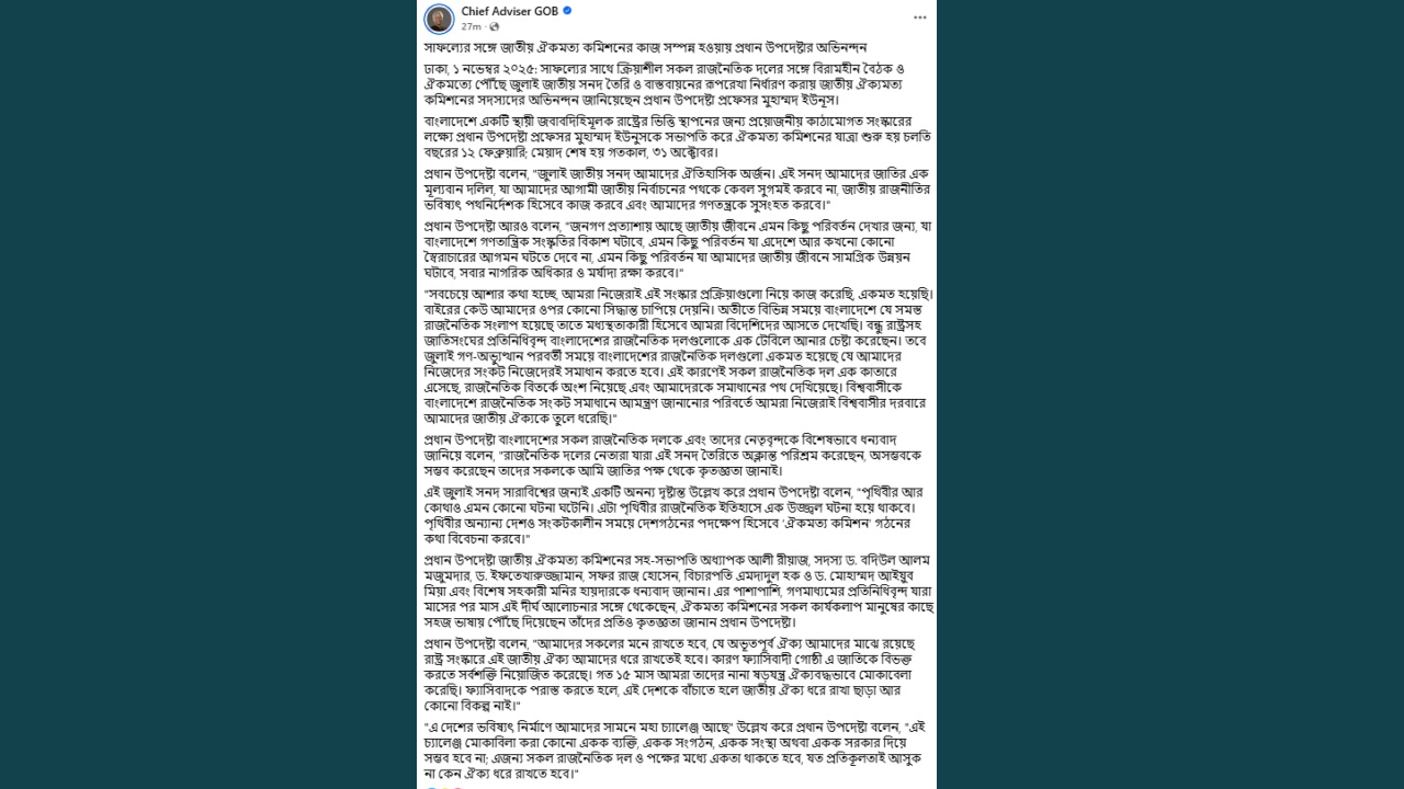 সাফল্যের সঙ্গে ঐকমত্য কমিশনের কাজ শেষ হওয়ায় প্রধান উপদেষ্টার অভিনন্দন
