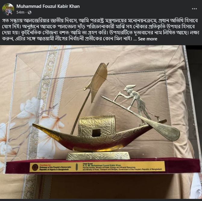 তিনি লিখেছেন, গত সন্ধ্যায় আলজেরিয়ার জাতীয় দিবসে, আমি পররাষ্ট্র মন্ত্রণালয়ের মনোনয়নক্রমে, প্রধান অতিথি হিসেবে যোগ দিই। অনুষ্ঠানে আমাকে পালতোলা দাঁড় পরিচালনাকারী মাঝিসহ নৌকার প্রতিকৃতি উপহার হিসেবে দেওয়া হয়। কূটনৈতিক সৌজন্য বশত: আমি তা গ্রহণ করি। উপহারটিতে দূতাবাসের নাম লিখিত আছে। লক্ষ্য করুন, এটার সঙ্গে আওয়ামী লীগের নির্বাচনী প্রতীকের কোন মিল নাই।