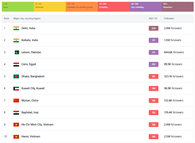 আইকিউএয়ারের দেওয়া তথ্যে দেখা যায়, দূষিত শহরের তালিকায় প্রথম স্থানে রয়েছে ভারতের দিল্লি, স্কোর ৫৫৯। দ্বিতীয় অবস্থানে রয়েছে ভারতের কোলকাতা, বায়ুর মানের স্কোর ২১১, তৃতীয় স্থানে রয়েছে পাকিস্তানের লাহোর, স্কোর ২১১।