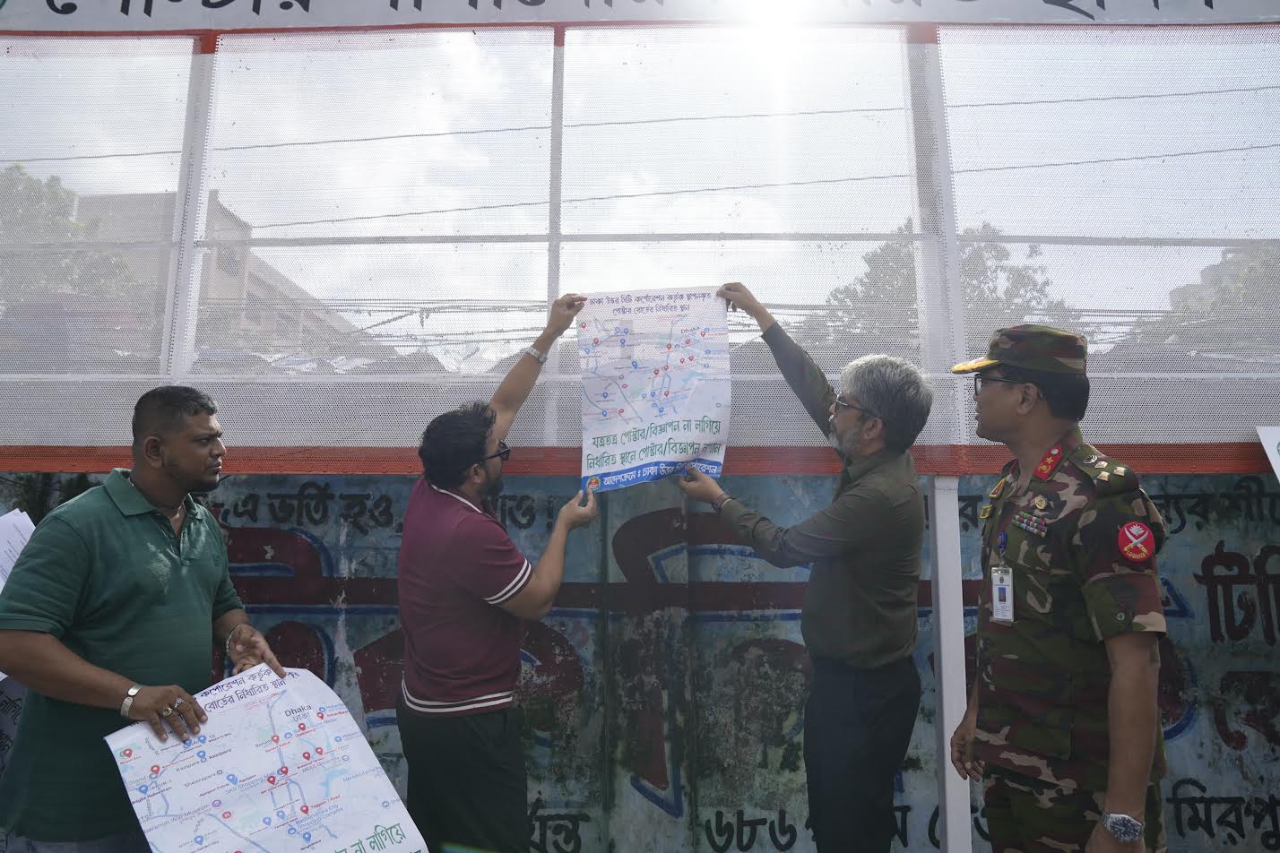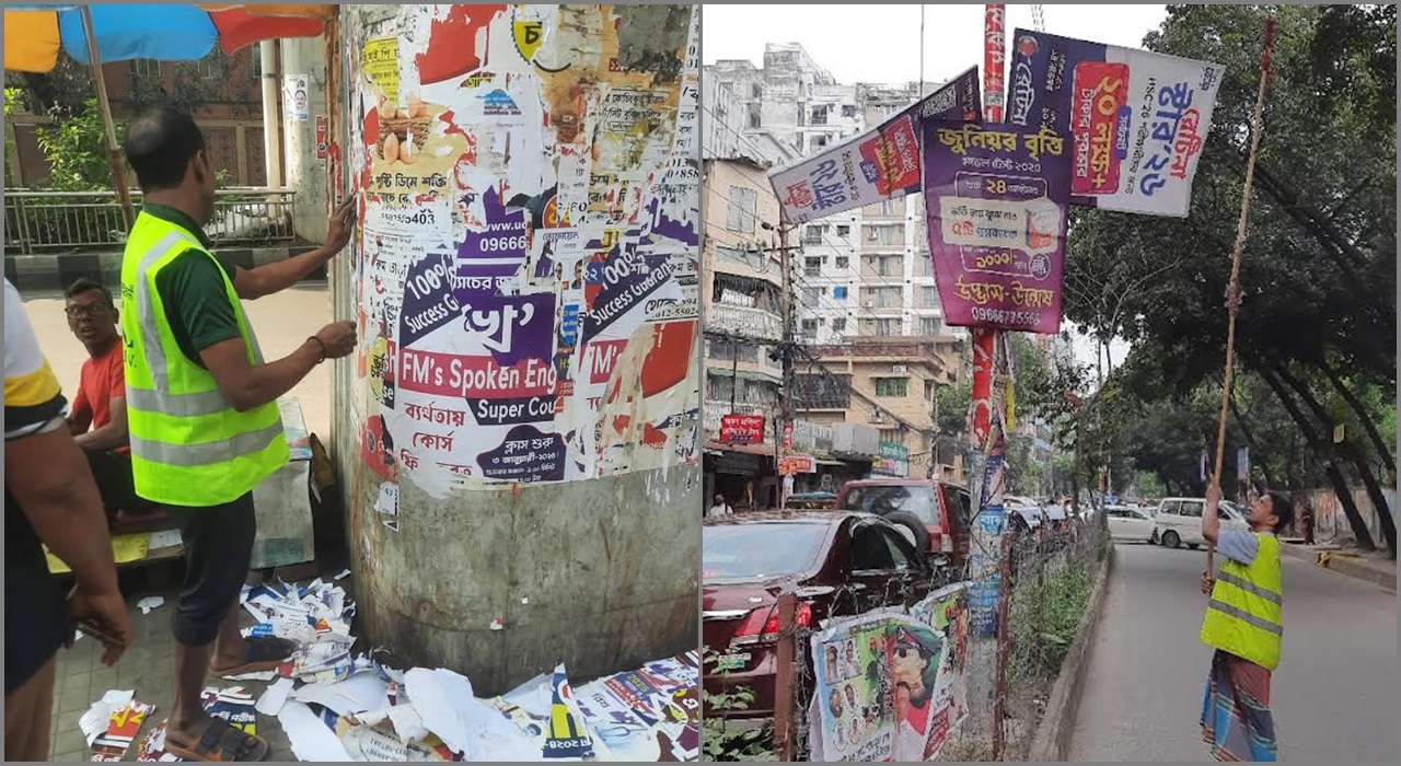‘যত্রতত্র পোস্টার বা ফেস্টুন লাগানো সম্পূর্ণ নিষিদ্ধ করার মতো স্পষ্ট আইন থাকলেও বাস্তবে তা-র প্রয়োগ তেমন দেখা যায় না। সিটি কর্পোরেশনের নির্ধারিত স্থানের বাইরে কোনো পোস্টার লাগানোর কথা নয়; তবুও প্রতিদিনই নতুন নতুন প্রচারণা যুক্ত হচ্ছে শহরের বিভিন্ন প্রান্তে।’