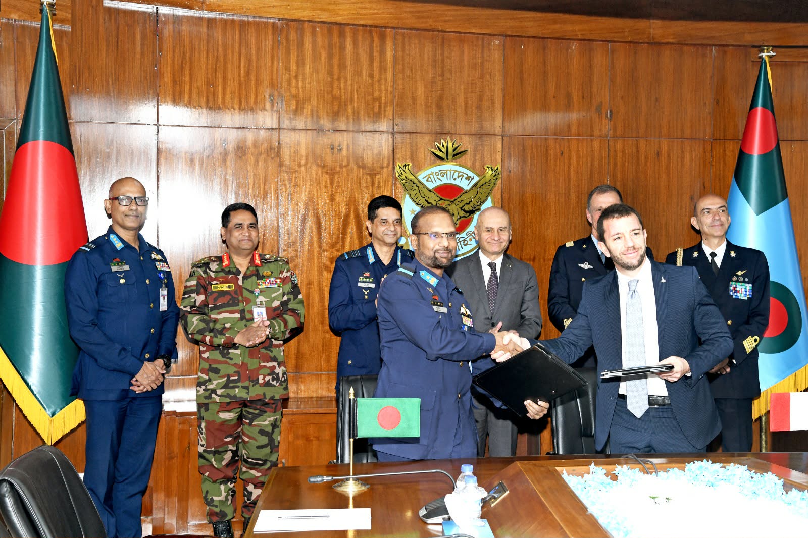 আইএসপিআর জানায়, আজ বিমান বাহিনী সদরদপ্তরে বিমান বাহিনী প্রধান এয়ার চিফ মার্শাল হাসান মাহমুদ খাঁন এবং বাংলাদেশে নিযুক্ত ইতালির রাষ্ট্রদূত আন্তোনিও আলেসান্দ্রো'র উপস্থিতিতে বাংলাদেশ বিমান বাহিনী এবং লিওনার্দো এস পি এ ইতালি এর মধ্যে লেটার অব ইনটেন্ট স্বাক্ষরিত হয়।