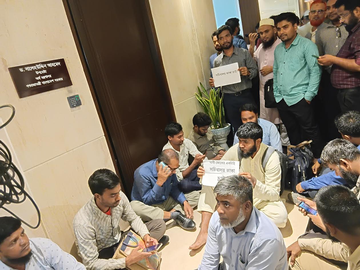 সচিবালয়ে কর্মরত চাকরিজীবীদের ২০ শতাংশ সচিবালয় ভাতার দাবিতে অংশ নেওয়া মন্ত্রণালয় ও বিভাগের কর্মকর্তা-কর্মচারীরা এবার উপদেষ্টার দরজার সামনে বসে পড়েছেন। বিক্ষোভকারীরা উপদেষ্টার দরজার সামনে হ্যান্ড মাইক দিয়ে এবার ভুয়া ভুয়া স্লোগান দিচ্ছেন।