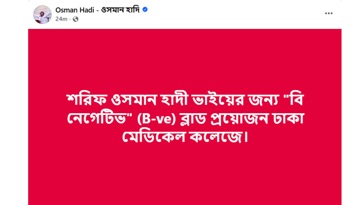 ওসমান হাদির ফেসবুক পেজ থেকে জানানো হয়েছে তার জন্য ‘বি’ নেগেটিভ রক্তের প্রয়োজন। তবে হাদির শারীরকি অবস্থা সম্পর্কে এখনও কোনো চিকিৎসকের বক্তব্য পাওয়া যায়নি।