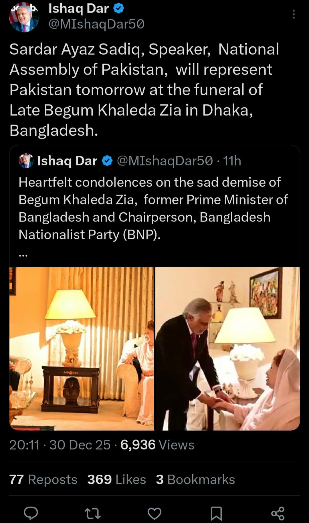 এদিকে ঢাকার পাকিস্তান হাইকমিশন সূত্রে জানা যায়, ইসহাক দারের পরিবর্তে খালেদা জিয়ার জানাজায় অংশ নিতে ঢাকায় আসছেন পাকিস্তানের পার্লামেন্টের স্পিকার সরদার আইয়াজ সাদিক। যদিও আজ (মঙ্গলবার) সন্ধ্যা অবধি খালেদা জিয়ার জানাজায় পাকিস্তানের ইসহাক দারের অংশ নেওয়ার তথ্য দিয়েছে।