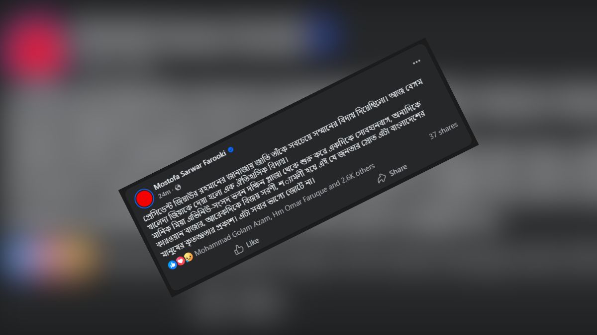 প্রেসিডেন্ট জিয়াউর রহমানের জানাজায় জাতি তাকে সবচেয়ে সম্মানের বিদায় দিয়েছিলো। আজ খালেদা জিয়াকে দেওয়া হলো এক ঐতিহাসিক বিদায়, এটা সবার ভাগ্যে জোটে না বলে মন্তব্য করেছেন সংস্কৃতি বিষয়ক উপদেষ্টা মোস্তফা সরয়ার ফারুকী।