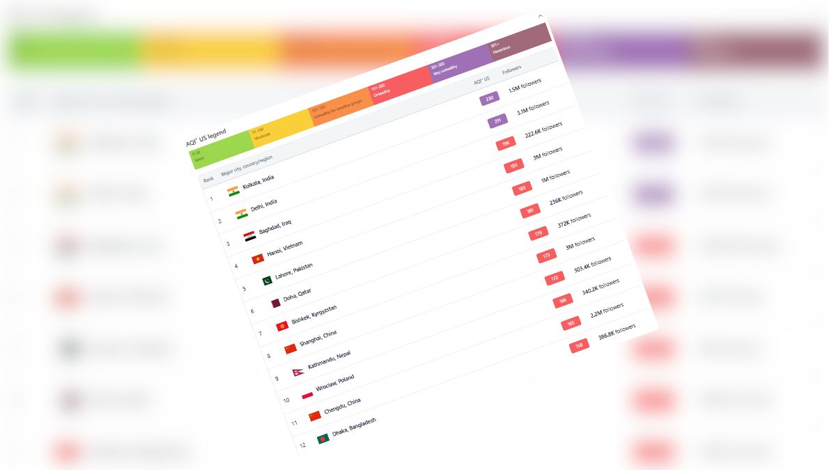 একই সময়ে দূষিত শহরের তালিকার শীর্ষ প্রথম ও দ্বিতীয় অবস্থানে রয়েছে ভারতের কলকাতা ও দিল্লি, শহর দুটির স্কোর যথাক্রমে ২৩০ ও ২১১। তৃতীয় অবস্থানে রয়েছে ইরাকের বাগদাদ শহর, যার স্কোর ১৯৬। তালিকার চতুর্থ ও পঞ্চম অবস্থানে রয়েছে যথাক্রমে ভিয়েতনামের হ্যানয় (স্কোর ১৯৩) ও পাকিস্তানের লাহোর শহর (স্কোর ১৮৩)।