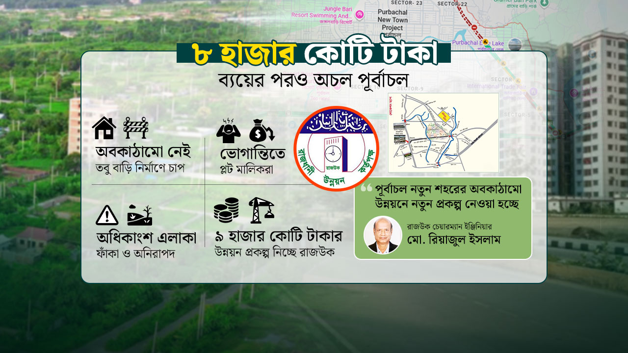 ঢাকার আবাসন সংকটের সমাধান হিসেবে নেওয়া পূর্বাচল নতুন শহর প্রকল্প ৩১ বছরেও পুরোপুরি বাসযোগ্য হয়নি। মৌলিক নাগরিক সুবিধা, অবকাঠামো ও নিরাপত্তার অভাবে প্লট মালিকরা যেমন হতাশ, তেমনি প্রকল্প বাস্তবায়নে রাজউকের দীর্ঘসূত্রিতাও নতুন করে প্রশ্নের মুখে পড়েছে।