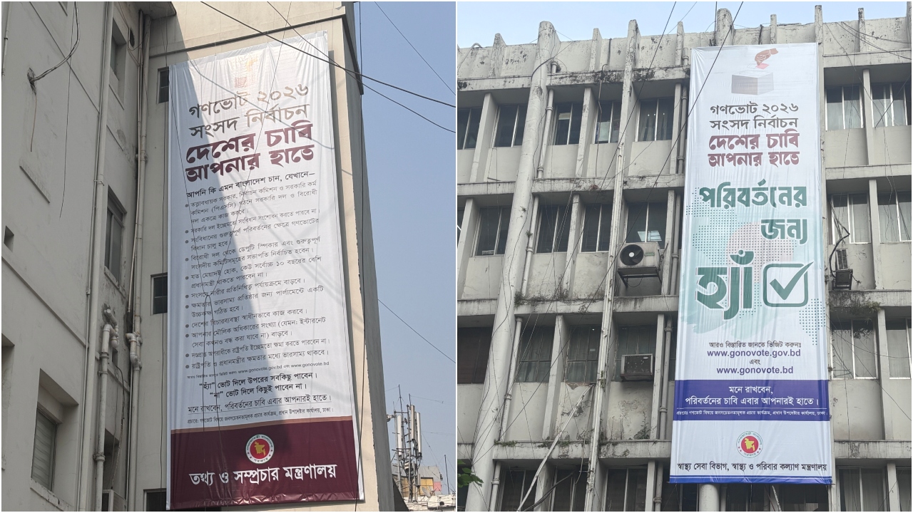 নির্দেশিত দুটি ব্যানারের একটিতে ‘গণভোট ২০২৬, সংসদ নির্বাচন- দেশের চাবি আপনার হাতে’ শিরোনামে গণভোটের মূল বার্তা তুলে ধরা হয়েছে। এতে ভোটারদের উদ্দেশ্যে প্রশ্ন আকারে জানানো হয়েছে, তারা কেমন বাংলাদেশ চান। ব্যানারে উল্লেখ রয়েছে, সংবিধান সংস্কারের মাধ্যমে তত্ত্বাবধায়ক সরকার, নির্বাচন কমিশন ও সরকারি কর্ম কমিশন (পিএসসি) গঠনে সরকারি ও বিরোধী দলের যৌথ ভূমিকা নিশ্চিত করা হবে। পাশাপাশি সরকার এককভাবে ইচ্ছেমতো সংবিধান সংশোধন করতে পারবে না এবং গুরুত্বপূর্ণ সাংবিধানিক পরিবর্তনের ক্ষেত্রে গণভোট বাধ্যতামূলক করা হবে।