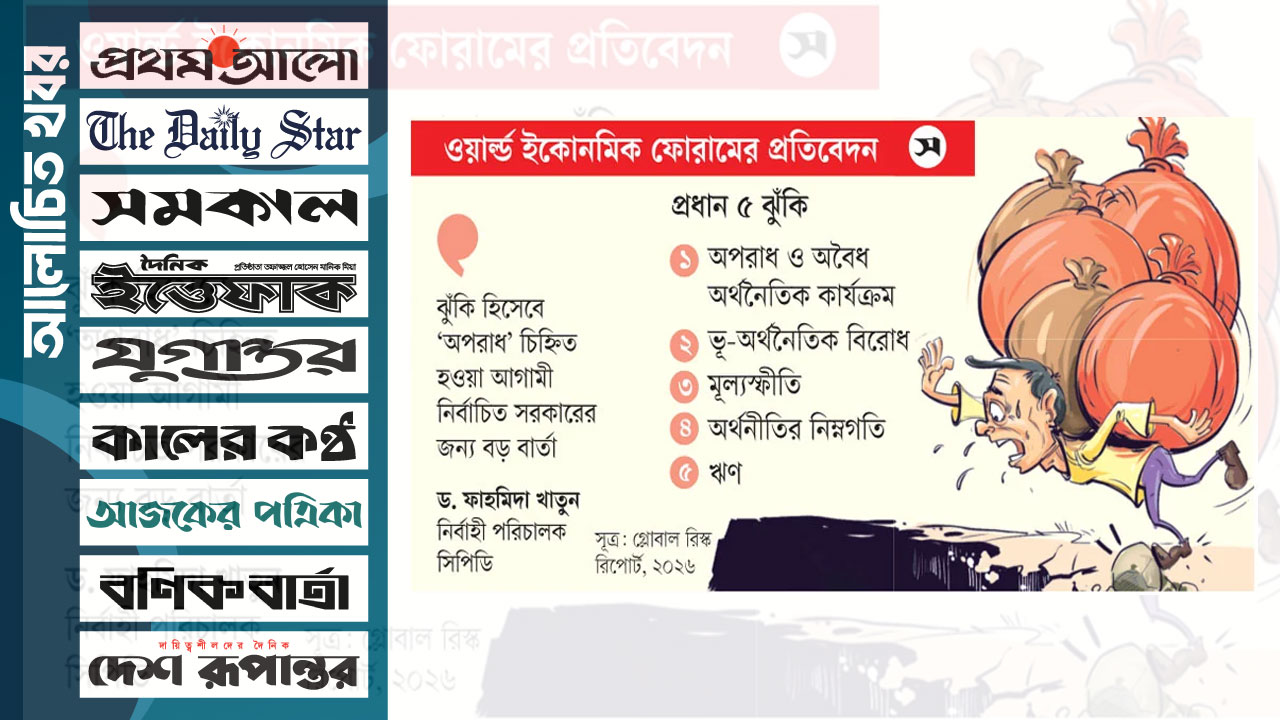 গতকাল বুধবার ওয়ার্ল্ড ইকোনমিক ফোরাম (ডব্লিউইএফ) জেনেভা থেকে ‘গ্লোবাল রিস্ক রিপোর্ট-২০২৬’ প্রকাশ করেছে। এতে বিশ্বের জন্য প্রধান ঝুঁকি হিসেবে উঠে এসেছে ভূ-অর্থনৈতিক বিরোধ। বাংলাদেশের ক্ষেত্রে এটি দ্বিতীয় প্রধান ঝুঁকি। গত কয়েক বছরে ভূ-অর্থনৈতিক বিরোধ বা সংঘাত বাংলাদেশের প্রথম পাঁচ ঝুঁকির তালিকায় ছিল না।