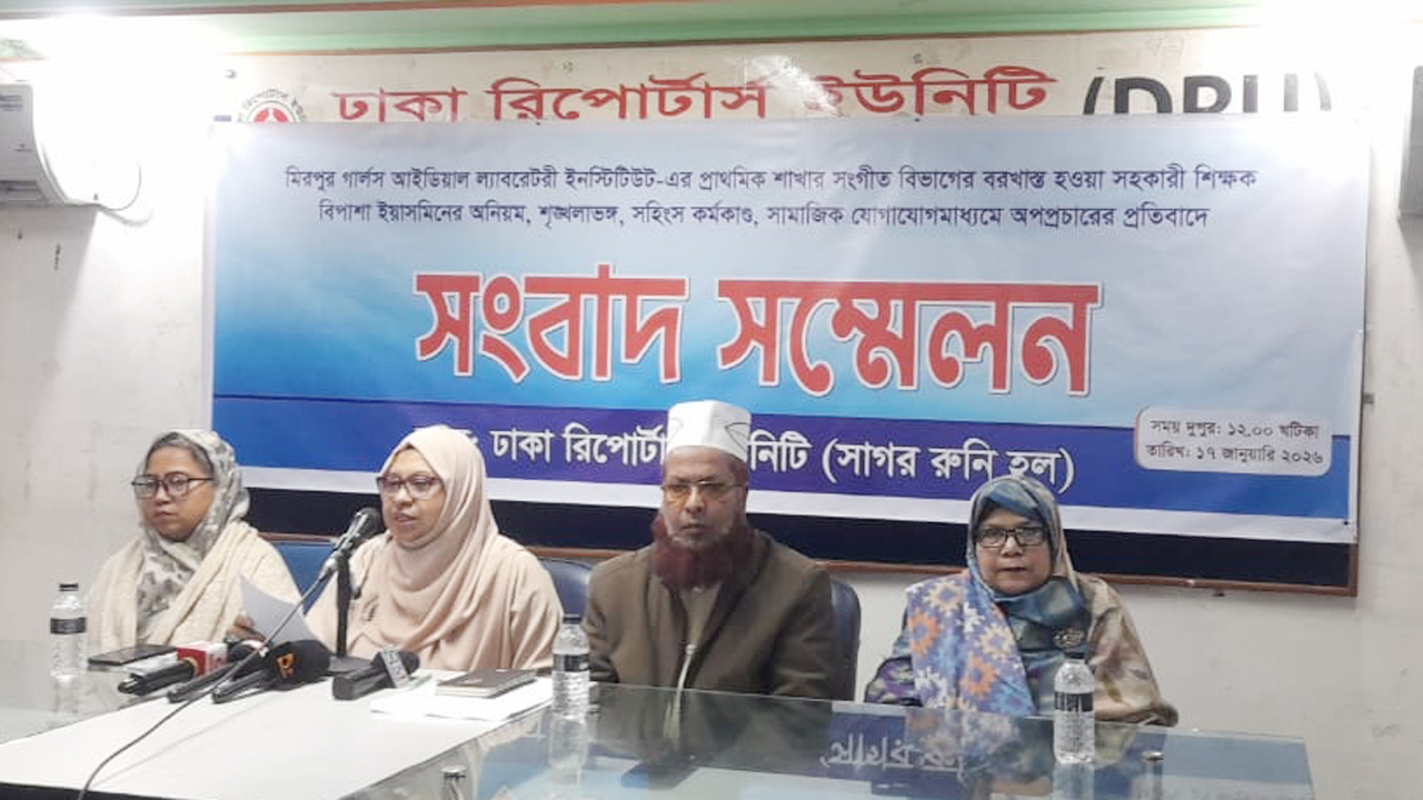মিরপুর গার্লস আইডিয়াল ল্যাবরেটরি ইনস্টিটিউটের বহিষ্কৃত সহকারী শিক্ষক (সংগীত) বিপাশা ইয়াসমিনের প্রতিষ্ঠানের বিরুদ্ধে ধারাবাহিক অপপ্রচার, মিথ্যা অভিযোগ ও হয়রানি থেকে বাঁচতে সহযোগিতা চেয়ে সংবাদ সম্মেলন করেছেন শিক্ষক ও কর্মকর্তারা।
