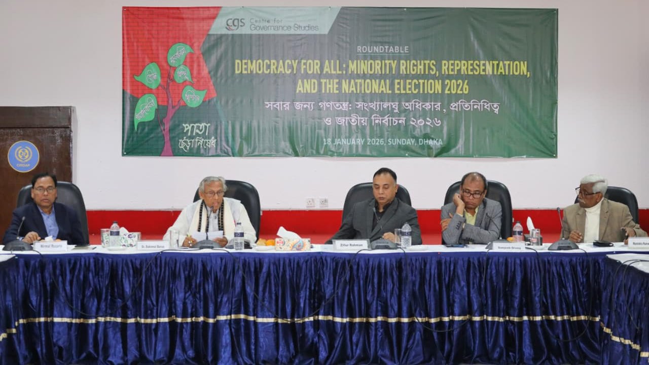 রোববার (১৮ জানুয়ারি) সেন্টার ফর গভর্ন্যান্স স্টাডিজ (সিজিএস) সবার জন্য গণতন্ত্র: সংখ্যালঘু অধিকার, প্রতিনিধিত্ব ও জাতীয় নির্বাচন ২০২৬ শীর্ষক গোলটেবিল আলোচনায় বক্তারা এসব কথা বলেন।
