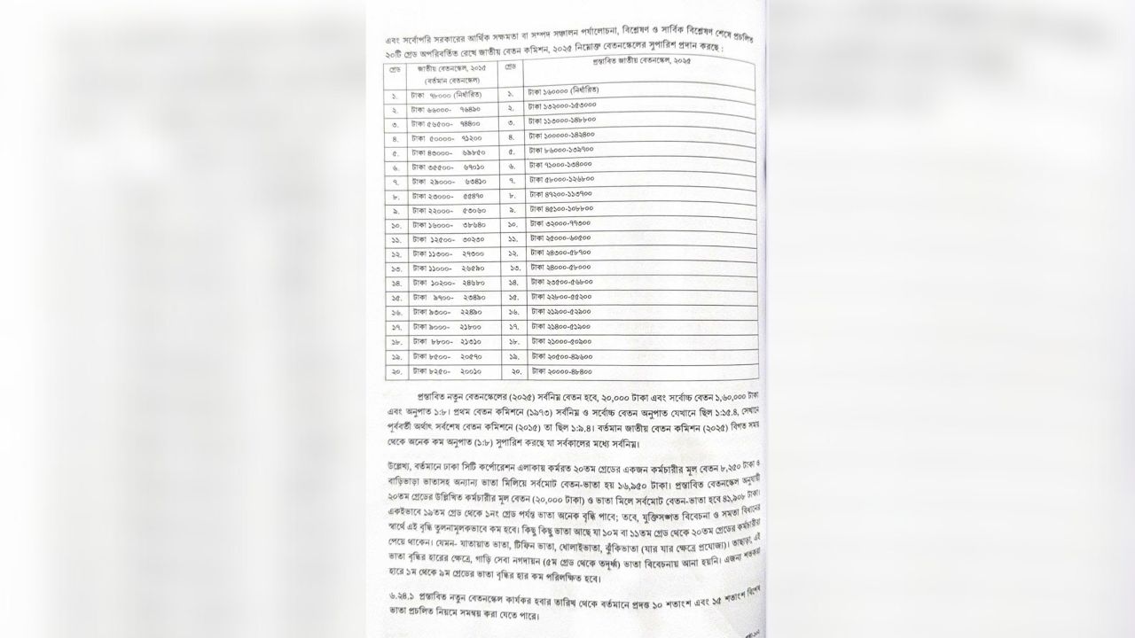 কমিশন সরকারি কর্মচারীদের জন্য মোট ২০টি গ্রেডে বেতন স্কেল সুপারিশ করেছে। এতে সর্বনিম্ন বেতন স্কেল ৮ হাজার ২৫০ টাকা থেকে বাড়িয়ে ২০ হাজার টাকা এবং সর্বোচ্চ বেতন স্কেল ৭৮ হাজার টাকা থেকে বাড়িয়ে ১ লাখ ৬০ হাজার টাকা করার প্রস্তাব দেওয়া হয়েছে।
