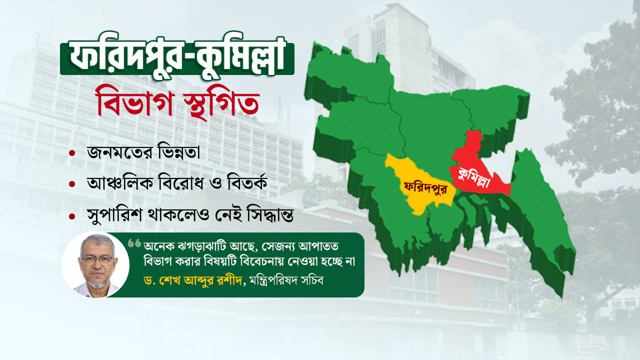 জনপ্রশাসন সংস্কার কমিশনের সুপারিশ ও প্রাথমিক প্রস্ততি থাকা সত্ত্বেও আপাতত হচ্ছে না বহুল আলোচিত ফরিদপুর ও কুমিল্লা বিভাগ। প্রশাসনিক পুনর্বিন্যাস সংক্রান্ত জাতীয় বাস্তবায়ন কমিটির (নিকার) সাম্প্রতিক সভায় নতুন এই বিভাগ গঠনের প্রস্তাবটি তোলা হয়নি। মূলত নতুন বিভাগ গঠনকে কেন্দ্র করে দেশের বিভিন্ন স্থানে সৃষ্ট বিতর্ক ও আঞ্চলিক বিরোধের বিষয়টি বিবেচনায় নিয়ে আপাতত এই প্রক্রিয়া স্থগিত রাখা হয়েছে।