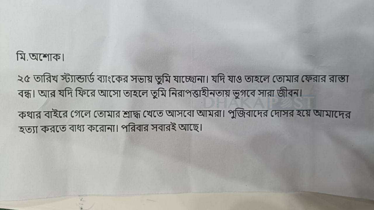 পুলিশ জানিয়েছে চিরকুটে লেখা রয়েছে, ‘মি. অশোক, ২৫ তারিখ স্ট্যান্ডার্ড ব্যাংকের সভায় তুমি যাচ্ছো না। যদি যাও, তাহলে তোমার ফেরার রাস্তা বন্ধ। আর যদি ফিরে আসো, তাহলে তুমি নিরাপত্তাহীনতায় ভুগবে সারা জীবন। কথার বাইরে গেলে তোমার শ্রাদ্ধ খেতে আসবো আমরা। পুঁজিবাদের দোসর হয়ে আমাদের হত্যা করতে বাধ্য করো না। পরিবার সবারই আছে।’