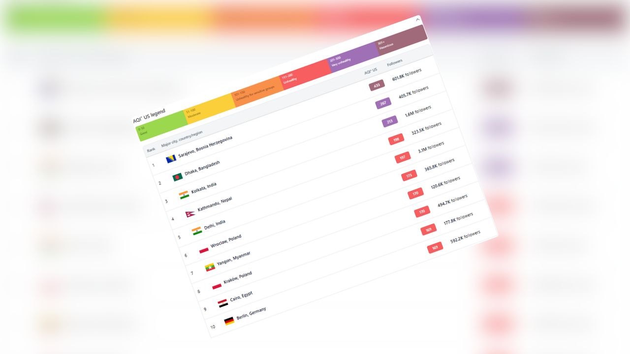 একই সময়ে দূষিত শহরের তালিকার শীর্ষে রয়েছে বসনিয়া হার্জেগোভিনার রাজধানী সারাজেভো, যার স্কোর ৪৩৩। এ ছাড়া তালিকার তৃতীয় ও চতুর্থ অবস্থানে রয়েছে যথাক্রমে ভারতের কলকাতা (স্কোর ২১৩) ও নেপালের কাঠমান্ডু (স্কোর ১৯৮)। তালিকার পঞ্চম অবস্থানে রয়েছে ভারতের দিল্লি শহর, যার স্কোর ১৯৭।
