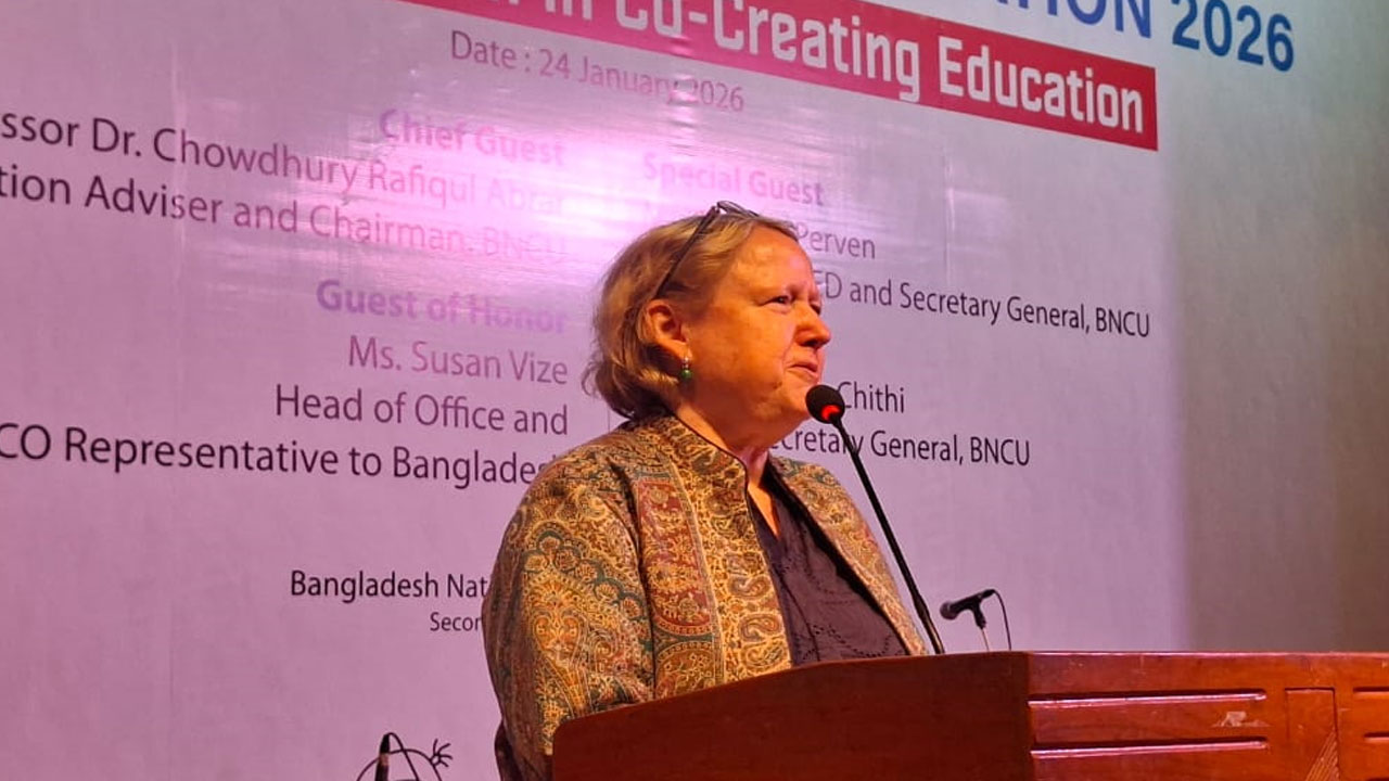 তরুণদের অংশগ্রহণ ছাড়া বাংলাদেশের শিক্ষা ব্যবস্থার কাঙ্ক্ষিত পরিবর্তন সম্ভব নয় বলে মন্তব্য করেছেন ইউনেসকোর হেড অব অফিস ও রিপ্রেজেন্টেটিভ টু বাংলাদেশ সুজান ভাইজ।