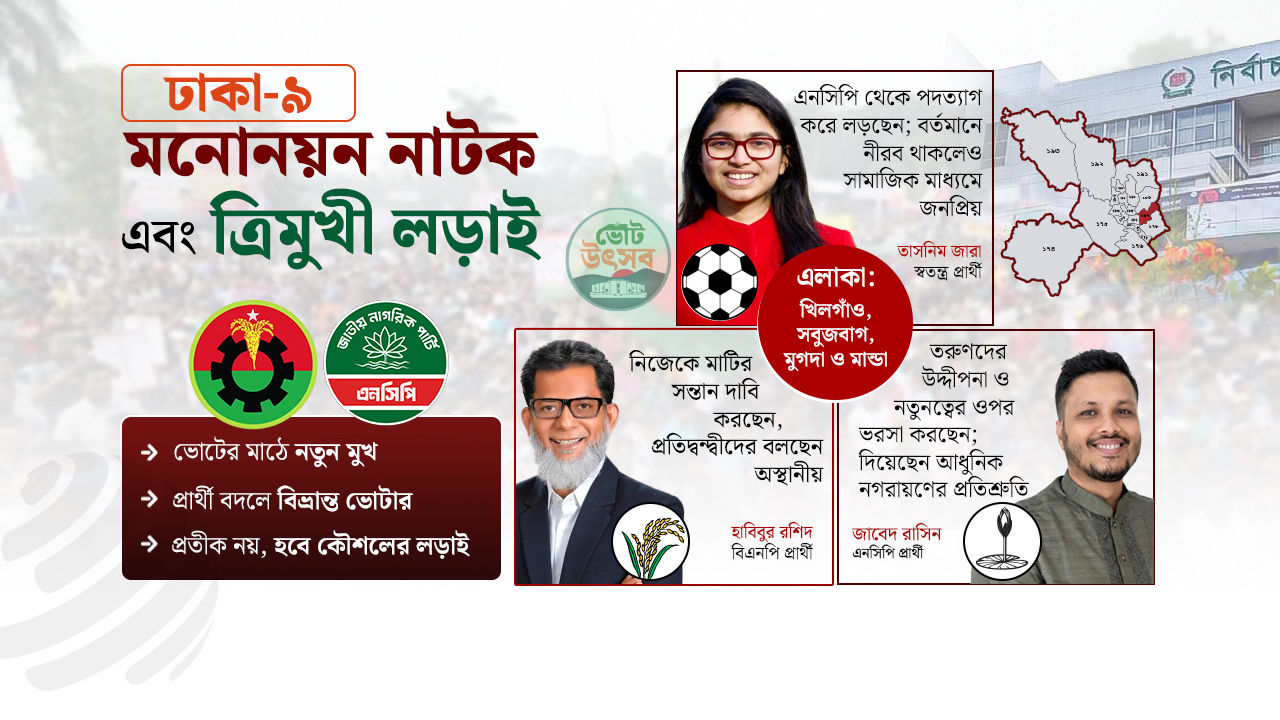 ঢাকার অন্যতম গুরুত্বপূর্ণ নির্বাচনী এলাকা ঢাকা-৯ আসনে লড়াইটা এখন আর কেবল প্রতীকের নয়, বরং কৌশলের। নির্বাচনের ডামাডোল শুরুর পর বিএনপি ও জামায়াতের সম্ভাব্য যে প্রার্থীদের ঘিরে মাঠ সরগরম ছিল, শেষ পর্যন্ত দলীয় সমীকরণে তাদের কাউকেই দেখা যাচ্ছে না চূড়ান্ত তালিকায়। হঠাৎ পরিচিত মুখদের বদলে আলোচনার বাইরে থাকা নেতাদের প্রার্থী করায় একদিকে যেমন ভোটের অঙ্ক পাল্টে যাচ্ছে, অন্যদিকে স্বতন্ত্র হয়ে লড়া নেতাদের কারণে ত্রিমুখী লড়াইয়ের আভাস পাওয়া যাচ্ছে।