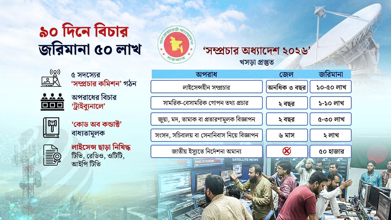 রাষ্ট্রের নিরাপত্তা বিঘ্নিত হয় এমন তথ্য প্রচার এবং অনুমোদনহীন বিজ্ঞাপন নিয়ন্ত্রণে কঠোর হচ্ছে সরকার। এ লক্ষ্যে জেল-জরিমানার বিধান রেখে ‘সম্প্রচার অধ্যাদেশ, ২০২৬’-এর খসড়া প্রস্তুত করেছে তথ্য ও সম্প্রচার মন্ত্রণালয়। প্রস্তাবিত এই আইনে জননিরাপত্তা রক্ষায় সামরিক-বেসামরিক গোপন তথ্য ফাঁস এবং জুয়া বা প্রতারণামূলক বিজ্ঞাপন প্রচারের ক্ষেত্রে কড়া শাস্তির প্রস্তাব করা হয়েছে।