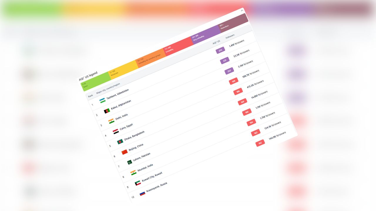 বায়ুদূষণে বিশ্বের শহরগুলোর তালিকায় প্রথম স্থানে রয়েছে উজবেকিস্তানের তাসখন্দ, স্কোর ২৫৫। দ্বিতীয় স্থানে থাকা আফগানিস্তানের কাবুলের স্কোর ২৩১। তৃতীয় স্থানে থাকা ভারতের দিল্লির স্কোর ২১২। চতুর্থ স্থানে থাকা মিশরের কায়রোর স্কোর ১৯৯।