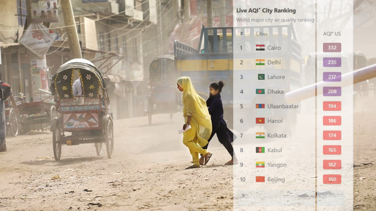 শীর্ষে থাকা অন্যান্য শহর তালিকার তথ্যমতে, ৩৩২ স্কোর নিয়ে আজ দূষণের শীর্ষে অবস্থান করছে মিশরের কায়রো। ভারতের রাজধানী দিল্লি ২৩৫ স্কোর নিয়ে রয়েছে দ্বিতীয় অবস্থানে। তৃতীয় অবস্থানে থাকা পাকিস্তানের লাহোরের স্কোর ২১৭। এছাড়া ভারতের আরেক শহর কলকাতা ১৭৪ স্কোর নিয়ে রয়েছে সপ্তম অবস্থানে। তালিকার শীর্ষ চারটি শহরের বায়ুমানই ‘খুব অস্বাস্থ্যকর’ পর্যায়ে রয়েছে।