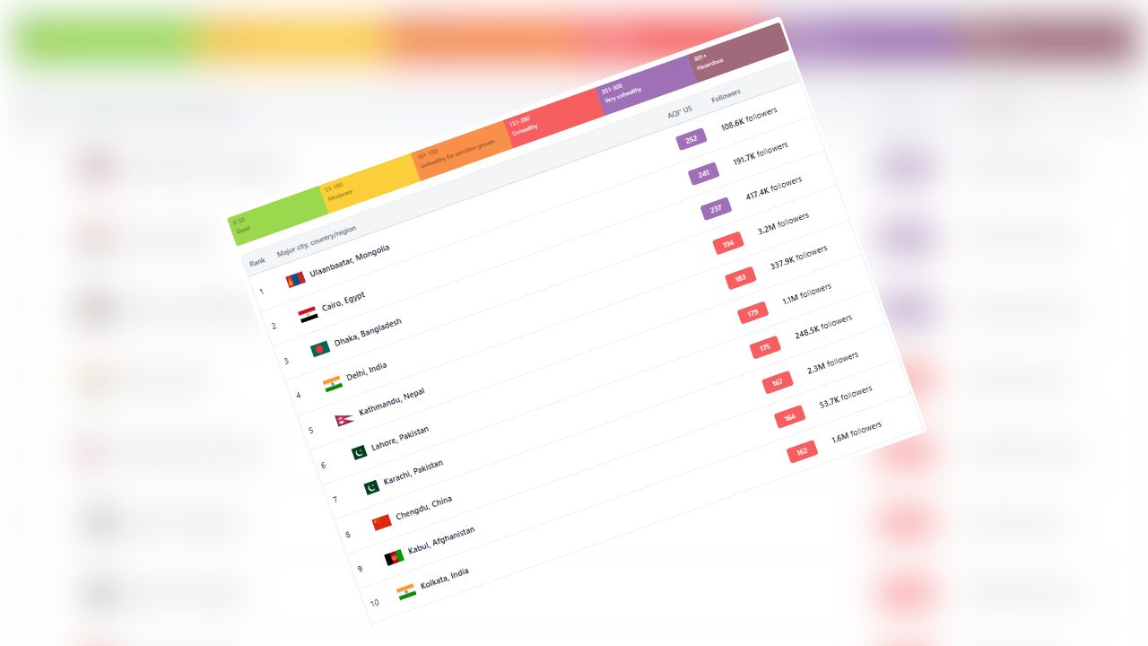একই সময়ে দূষিত শহরের তালিকার শীর্ষে রয়েছে মঙ্গোলিয়ার রাজধানী উলান বাটোর, যার স্কোর ২৫১। দ্বিতীয় অবস্থানে রয়েছে মিশরের কায়রো শহর, স্কোর ২৪১। তালিকার চতুর্থ ও পঞ্চম অবস্থানে রয়েছে যথাক্রমে ভারতের দিল্লি (স্কোর ১৯৪) ও নেপালের কাঠমান্ডু শহর (স্কোর ১৮৩)।