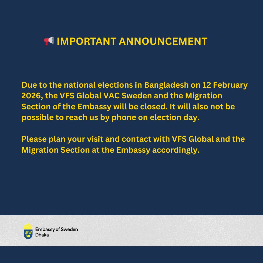 দূতাবাসের ঘোষণায় বলা হয়েছে, ১২ ফেব্রুয়ারি বাংলাদেশে জাতীয় নির্বাচনের কারণে ভিএফএস গ্লোবাল, ভিএসি সুইডেন এবং দূতাবাসের মাইগ্রেশন বিভাগের সকল কার্যক্রম বন্ধ থাকবে। শুধু তাই নয়, ওই দিন দূতাবাসের সঙ্গে ফোনেও যোগাযোগ করা সম্ভব হবে না।