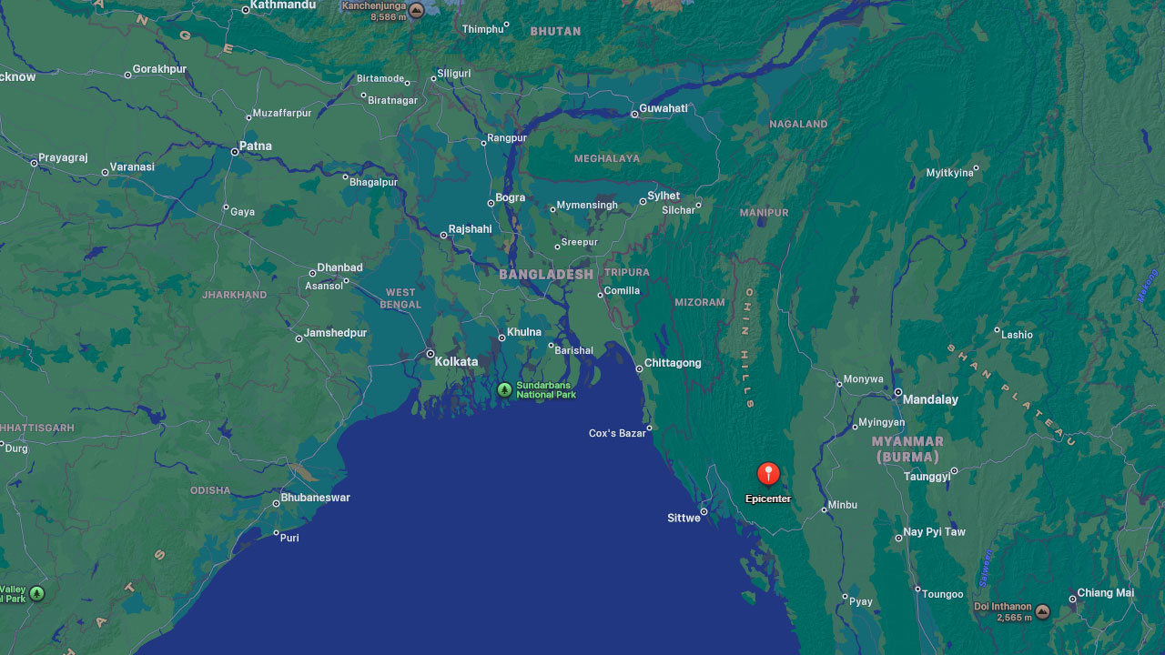 এই ভূমিকম্পের উৎপত্তিস্থল ঢাকা থেকে ৫১৬ কিলোমিটার দূরে মিয়ানমারের ইয়েনাংগুয়াং থেকে ৯৫ কিলোমিটার পশ্চিমে। রিখটার স্কেলে এর মাত্রা ছিল ৫ দশমিক ৯।