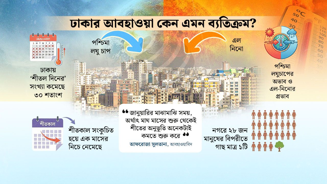 আবহাওয়ার তথ্য বিশ্লেষণে দেখা গেছে, এ বছর মাঘের প্রথম সপ্তাহেই দিনের তাপমাত্রা পৌঁছেছে ২৬-২৮ ডিগ্রি সেলসিয়াসে। রাতের ন্যূনতম তাপমাত্রাও ১৬-১৮ ডিগ্রি সেলসিয়াসের নিচে নামতে পারছে না বেশিরভাগ দিন (এখন পর্যন্ত)। আবহাওয়া অধিদপ্তরের তথ্যমতে, গত ১০ বছরে ঢাকায় শীতল দিনের (যখন সর্বনিম্ন তাপমাত্রা ১৫ ডিগ্রি সেলসিয়াসের নিচে নামে) সংখ্যা গড়ে ৩০ শতাংশ কমেছে।