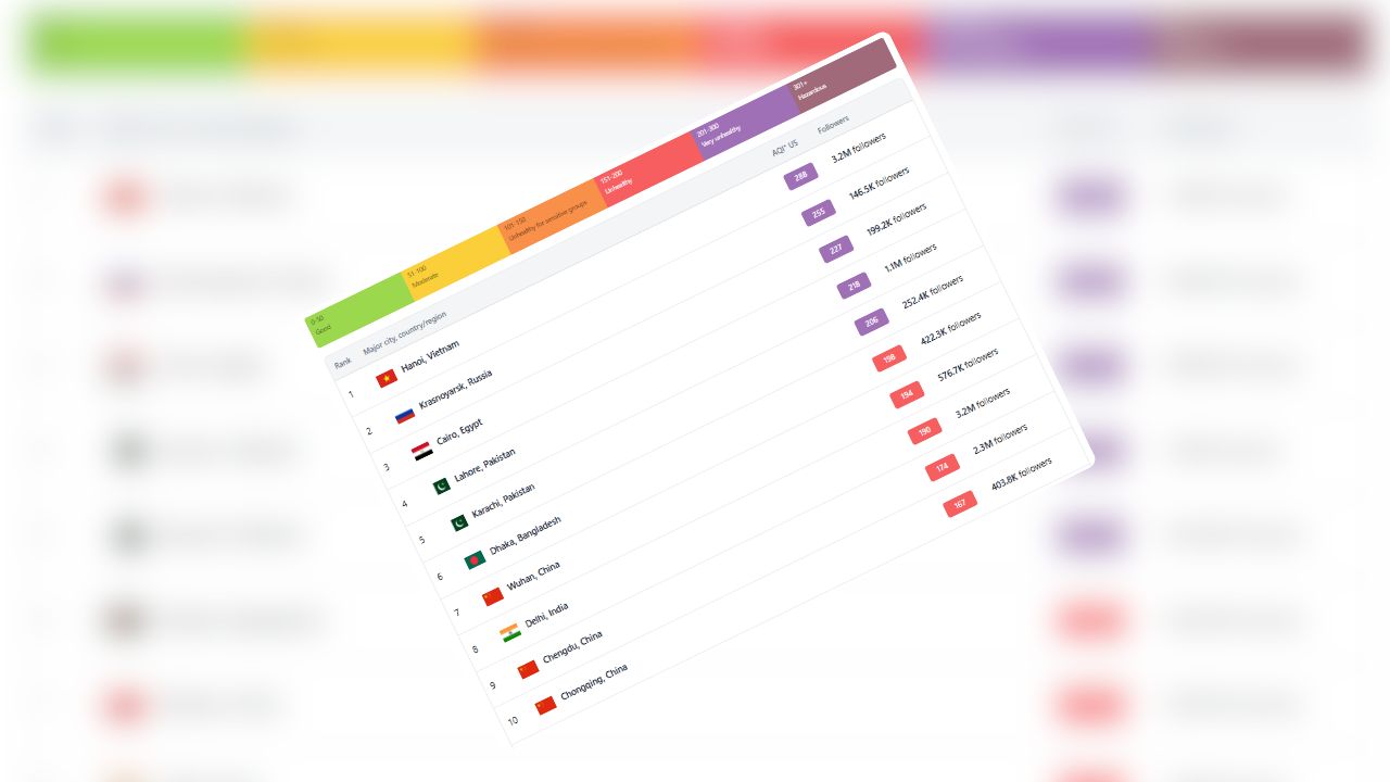 একই সময়ে দূষিত শহরের তালিকার শীর্ষে রয়েছে ভিয়েতনামের রাজধানী হ্যানয়, যার স্কোর ২৮৮। দ্বিতীয় অবস্থানে রয়েছে রাশিয়ার ক্রাসনোয়ার্স্ক শহর, স্কোর ২৫৫। এবং তৃতীয় অবস্থানে রয়েছে মিশরের কায়রো শহর (স্কোর ২২৭)।