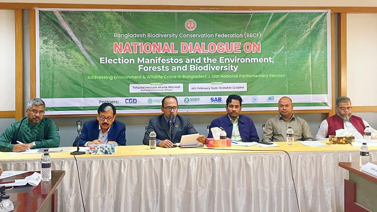শুক্রবার (৬ ফেব্রুয়ারি) জাতীয় প্রেসক্লাবের তোফাজ্জল হোসেন মানিক মিয়া হলে বাংলাদেশ বায়োডাইভারসিটি কনজারভেশন ফেডারেশনের (বিবিসিএফ) উদ্যোগে আয়োজিত ‘জাতীয় ম্যানিফেস্টো ডায়ালগ—পরিবেশ, বন ও জীববৈচিত্র্য : ত্রয়োদশ জাতীয় সংসদ নির্বাচনে পরিবেশ ও বন্যপ্রাণী অপরাধ’ শীর্ষক সংলাপে তারা এসব কথা বলেন।