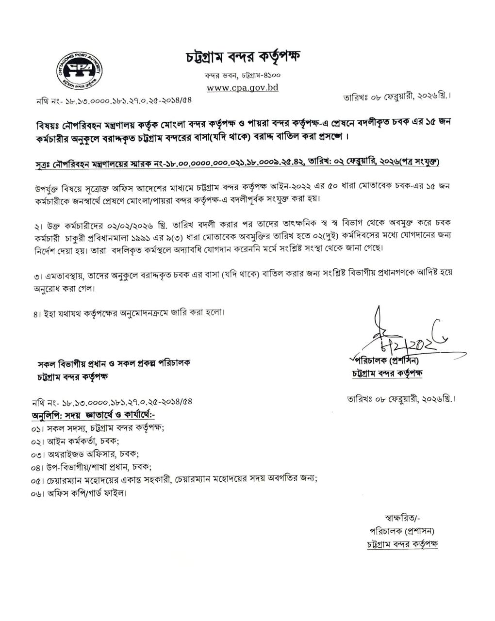 বন্দরের আদেশে বলা হয়, ১৫ জন কর্মচারীকে ২ ফেব্রুয়ারি জনস্বার্থে প্রেষণে মোংলা ও পায়রা বন্দরে বদলি করে সংযুক্ত করা হয়। বদলি করার পর তাদের নিজ নিজ বিভাগ থেকে অবমুক্ত করা হয়। অবমুক্তির তারিখ থেকে দুই কার্যদিবসে বদলিকৃত কর্মস্থলে যোগ দেওয়ার জন্য নির্দেশ দেওয়া হয়। তবে তারা এখনো বদলিকৃত কর্মস্থলে যোগ দেননি। এ জন্য তাদের অনুকূলে বরাদ্দ করা বাসা (যদি থাকে) বাতিল করার জন্য সংশ্লিষ্ট বিভাগীয় প্রধানদের নির্দেশ দেওয়া হয়েছে আদেশে।