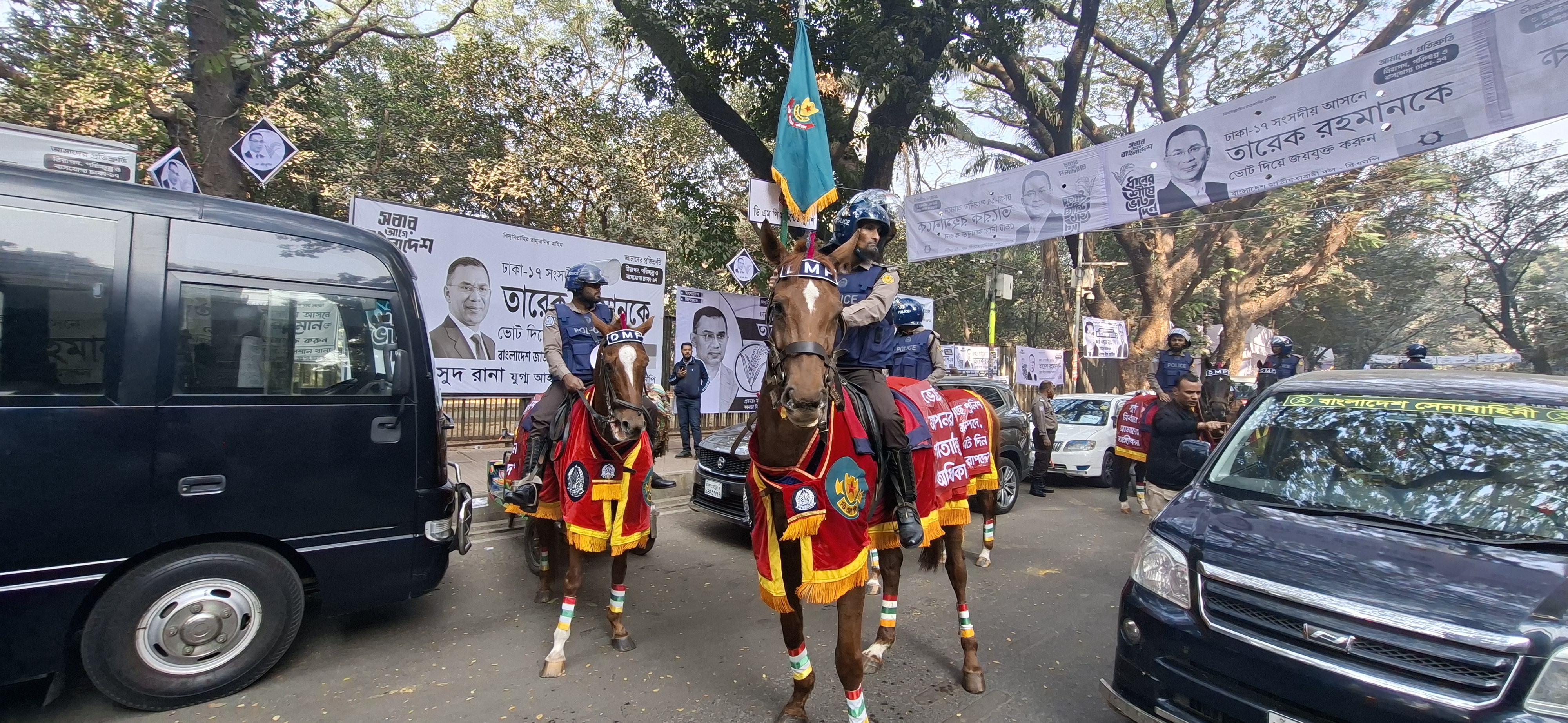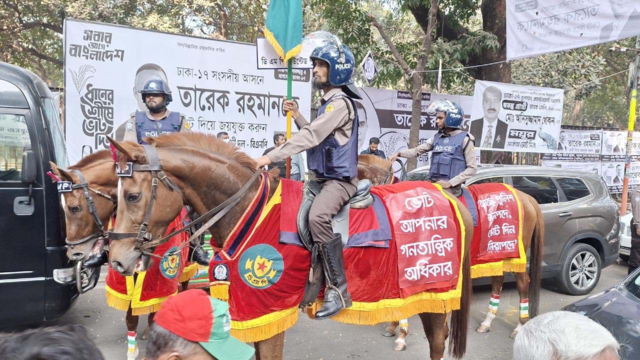সরেজমিনে দেখা গেছে, গুলশান মডেল স্কুল অ্যান্ড কলেজ কেন্দ্রের সামনে ডিএমপির অশ্বারোহী দলের হরিয়ানা জাতের সুঠাম দেহের, লম্বা ও বলিষ্ঠ গড়নের ছয়টি ঘোড়া নিয়ে টহল দিচ্ছে। ঘোড়ার পিঠে ছিল সুসজ্জিত স্যাডল ও নিরাপত্তা সামগ্রী। নিয়ন্ত্রণে থাকা পুলিশ সদস্যদের নির্দেশে তারা ধীর গতিতে চলাচল করছিল। এরসাথে যুক্ত করা হয়েছে বিভিন্ন সচেতনতামূলক স্লোগান। এর মধ্যে রয়েছে—‘সুষ্ঠু নির্বাচন হোক আমাদের অঙ্গীকার’ এবং ‘ভোট হোক উৎসবমুখর ও আনন্দঘন’।
