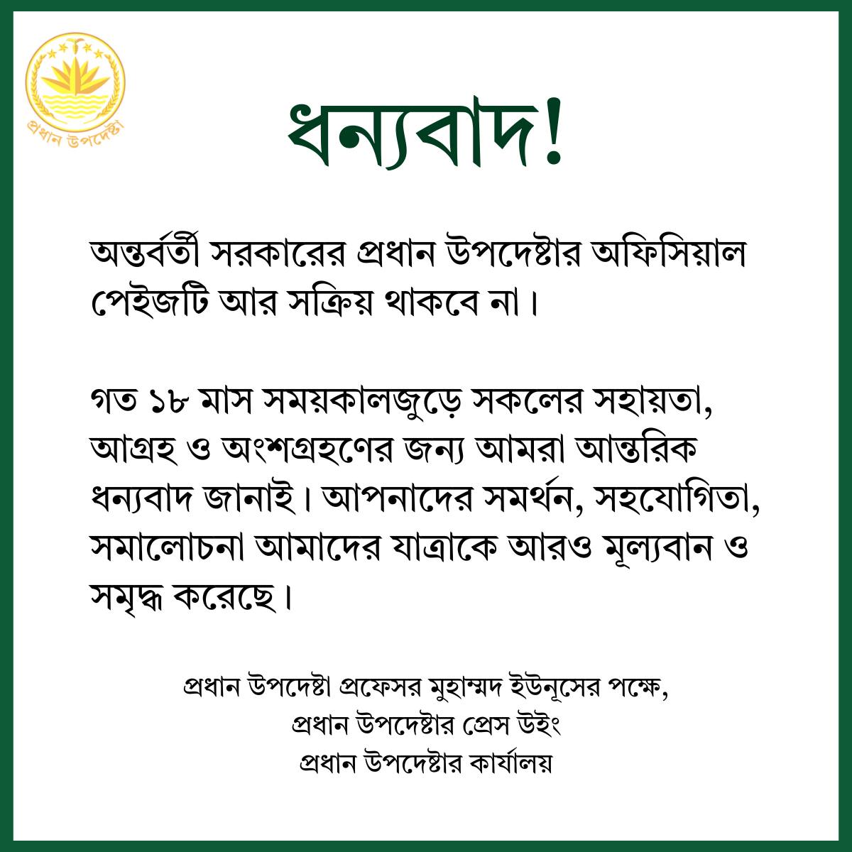 ফেসবুক পোস্টে জানানো হয়, ‘Chief Adviser GOB (Head of the Government)’ নামের এই অফিসিয়াল পেজটি এখন থেকে আর সক্রিয় থাকবে না। ২০২৪ সালের ১৪ আগস্ট অন্তর্বর্তী সরকার গঠনের পর জনযোগাযোগের অন্যতম মাধ্যম হিসেবে এই পেজটি খোলা হয়েছিল। বর্তমানে পেজটিতে ফলোয়ার সংখ্যা ৪৪ লাখেরও বেশি।