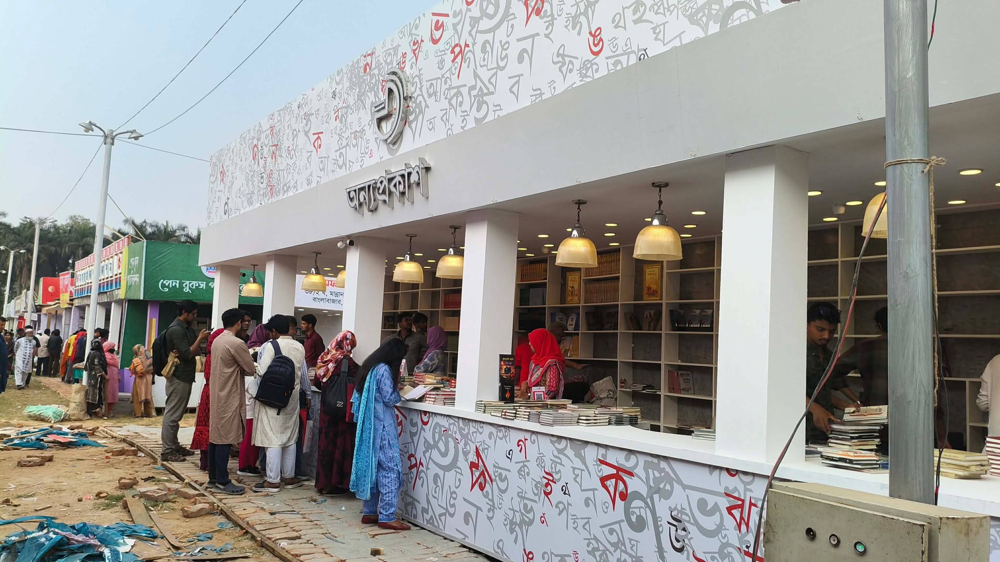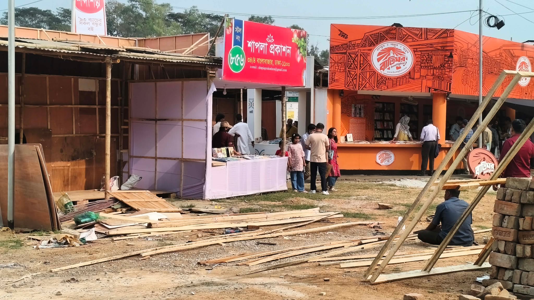 মেলার আরও ভেতরে প্রবেশ করতেই নির্মাণকর্মীদের স্টল তৈরির কাজে ব্যস্ত থাকতে দেখা গেছে। বইমেলা শুরু হলেও এখনো ওই স্টলগুলোর কাজ শেষ করতে পারেননি তারা। কেউ করাত দিয়ে কাঠ কাটছেন, আবার কেউ সেই কাঠ দিয়ে ফ্রেম তৈরি করছেন। তবে অধিকাংশ স্টলই নির্মাণকাজ শেষ করে বই প্রদর্শনী শুরু করতে পেরেছে। অন্যদিকে ইঞ্জিনিয়ারিং ইনস্টিটিউটের পাশের খাবারের দোকানগুলো এখনো তৈরি হয়নি। সব মিলিয়ে পুরো বইমেলার নির্মাণকাজ শেষ করতে অন্তত আরও ৫-৭ দিন সময় লেগে যাবে বলে জানিয়েছেন কর্মীরা।
