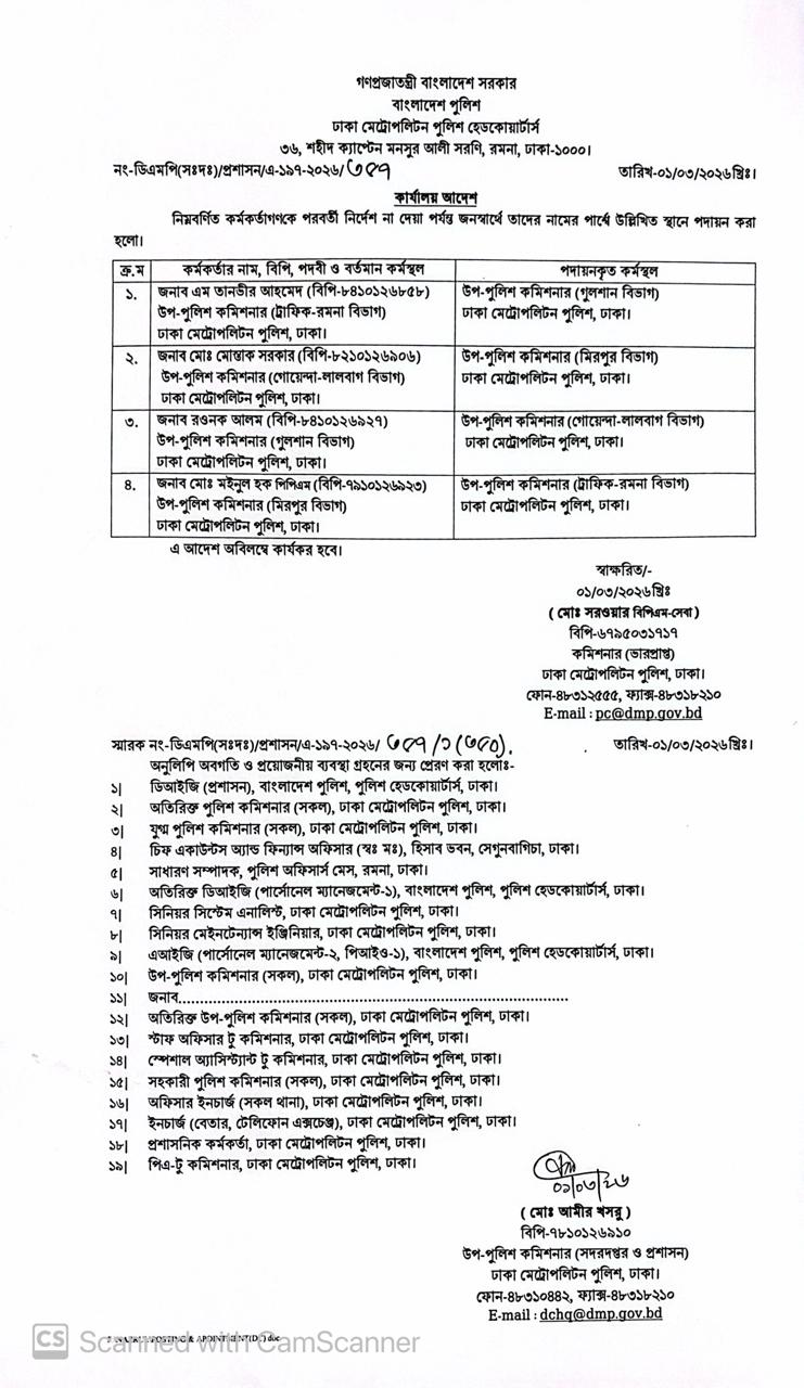 আদেশে বলা হয়, উপ-পুলিশ কমিশনার (ট্রাফিক-রমনা বিভাগ) এম তানভীর আহমেদকে উপ-পুলিশ কমিশনার (গুলশান বিভাগ) হিসেবে পদায়ন করা হয়েছে।