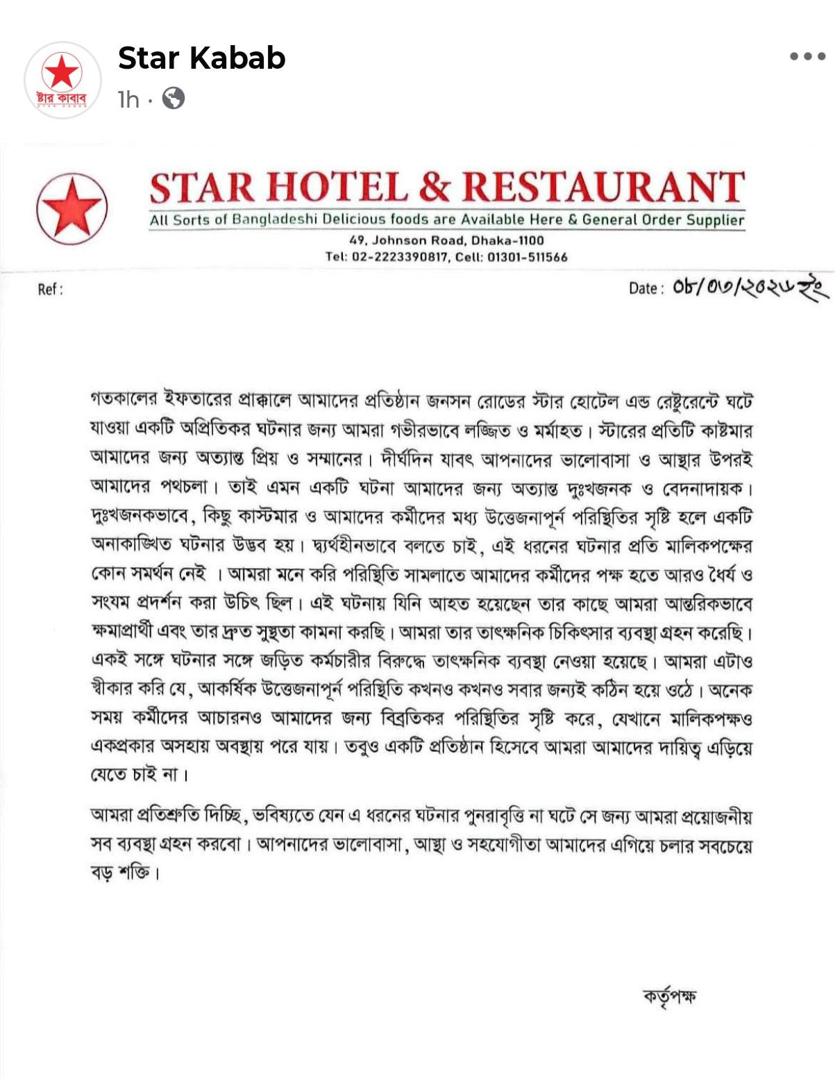 বিবৃতিতে স্টার হোটেল অ্যান্ড রেস্টুরেন্ট কর্তৃপক্ষ বলেছে, ‘স্টারের প্রতিটি কাস্টমার আমাদের জন্য অত্যন্ত প্রিয় ও সম্মানের। দীর্ঘদিন ধরে আপনাদের ভালোবাসা ও আস্থার ওপরই আমাদের পথচলা। তাই এমন একটি ঘটনা আমাদের জন্য অত্যন্ত দুঃখজনক ও বেদনাদায়ক। দুঃখজনকভাবে কিছু কাস্টমার ও আমাদের কর্মীদের মধ্যে উত্তেজনাপূর্ণ পরিস্থিতির সৃষ্টি হলে একটি অনাকাঙ্ক্ষিত ঘটনার উদ্ভব হয়। দ্ব্যর্থহীনভাবে বলতে চাই, এই ধরনের ঘটনার প্রতি মালিকপক্ষের কোনো সমর্থন নেই। আমরা মনে করি, পরিস্থিতি সামলাতে আমাদের কর্মীদের পক্ষ থেকে আরও ধৈর্য ও সংযম প্রদর্শন করা উচিত ছিল।’