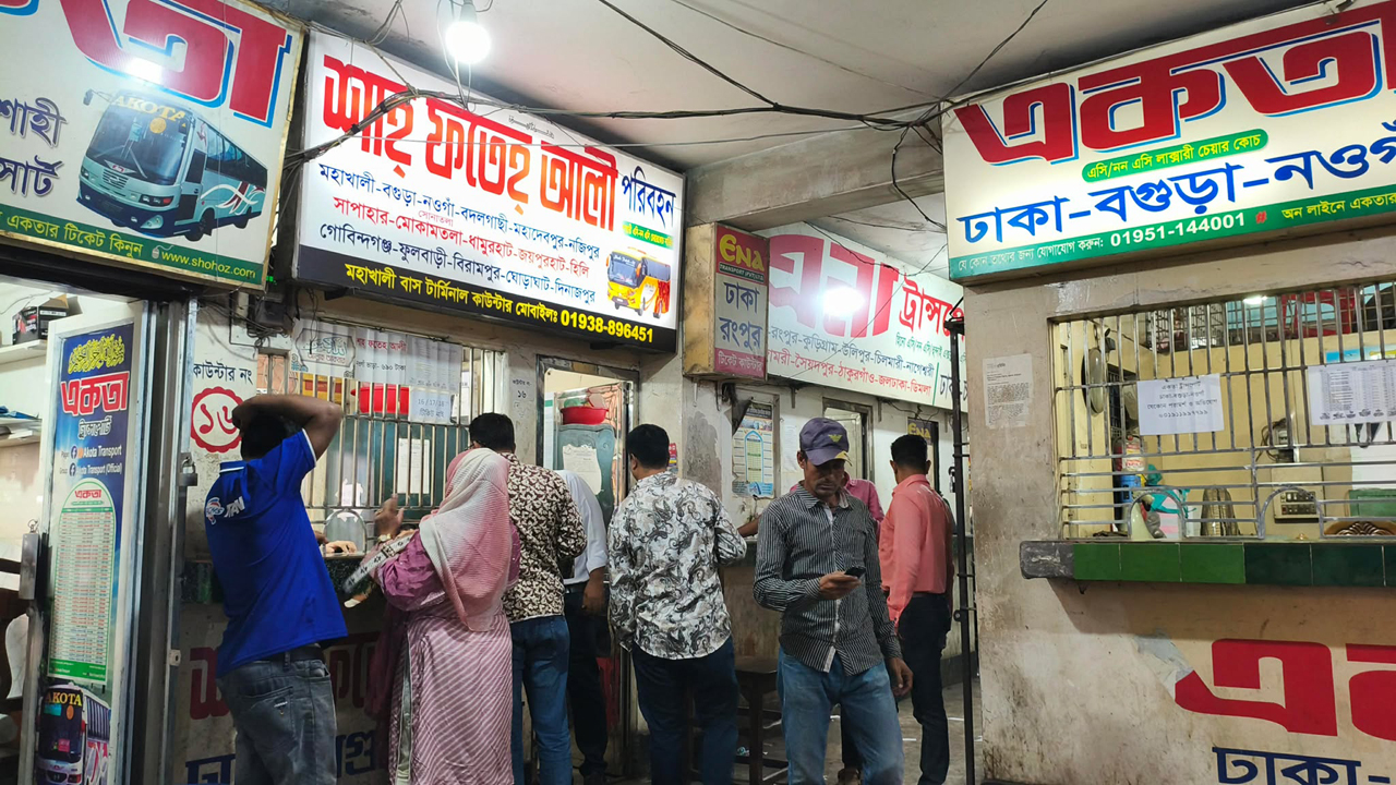 ঢাকা–বগুড়া রুটের একতা ট্রান্সপোর্টের কাউন্টারে দেখা গেছে, ‘ঈদ উপলক্ষ্যে বিআরটিএ নির্ধারিত ভাড়ার অতিরিক্ত ভাড়া নেওয়া হয় না’— এমন একটি ব্যানার টাঙানো রয়েছে। সেখানে যাত্রীরা মাঝেমধ্যে এসে চলতি বাসের টিকিট সংগ্রহ করছেন। তবে ঈদের অগ্রিম টিকিট আর নেই বলে জানানো হয়েছে।