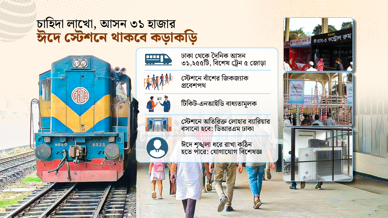 আসন্ন ঈদুল ফিতর উপলক্ষ্যে ঢাকা থেকে প্রতিদিন ৩১ হাজার ২৫৫টি ট্রেনের আসন বরাদ্দ থাকলেও টিকিটপ্রত্যাশীর সংখ্যা কয়েক লাখ। এই বিশাল ব্যবধান সামাল দিতে ঢাকা, বিমানবন্দর ও জয়দেবপুর স্টেশনে বাঁশের ‘জিকজ্যাক’ ব্যারিকেড তৈরি করা হয়েছে। প্ল্যাটফর্মে প্রবেশের আগে যাত্রীদের টিকিট ও এনআইডি বাধ্যতামূলকভাবে পরীক্ষা করা হবে। বিনা টিকিটে কেউ যেন স্টেশনে ঢুকতে না পারে, সেজন্য নেওয়া হয়েছে তিন স্তরের কঠোর নিরাপত্তা ব্যবস্থা