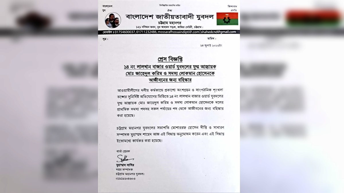 বিজ্ঞপ্তিতে উল্লেখ করা হয়, আওয়ামী লীগের দলীয় কর্মকাণ্ডে প্রকাশ্যে অংশগ্রহণ ও সাংগঠনিক শৃঙ্খলা ভঙ্গের সুনির্দিষ্ট অভিযোগের ভিত্তিতে মো. জাহেদুল করিম ও লোকমান হোসেনকে দলের প্রাথমিক সদস্য পদসহ সকল পর্যায়ের পদ থেকে আজীবনের জন্য বহিষ্কার করা হয়েছে।