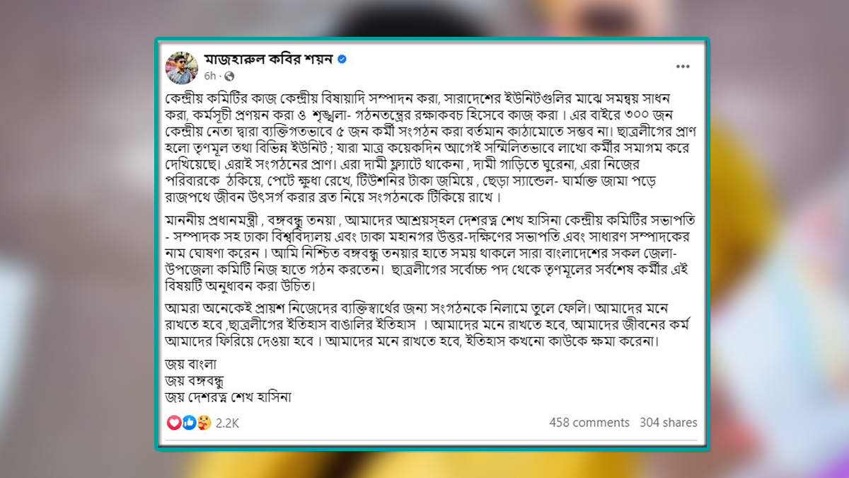 তিনি আরও লিখেন, ‘প্রধানমন্ত্রী, বঙ্গবন্ধু তনয়া, আমাদের আশ্রয়স্থল শেখ হাসিনা কেন্দ্রীয় কমিটির সভাপতি-সম্পাদকসহ ঢাকা বিশ্ববিদ্যলয় এবং ঢাকা মহানগর উত্তর-দক্ষিণের সভাপতি এবং সাধারণ সম্পাদকের নাম ঘোষণা করেন। আমি নিশ্চিত বঙ্গবন্ধু তনয়ার হাতে সময় থাকলে সারা বাংলাদেশের সকল জেলা-উপজেলা কমিটি নিজ হাতে গঠন করতেন। ছাত্রলীগের সর্বোচ্চ পদ থেকে তৃণমূলের সর্বশেষ কর্মীর এই বিষয়টি অনুধাবন করা উচিৎ।