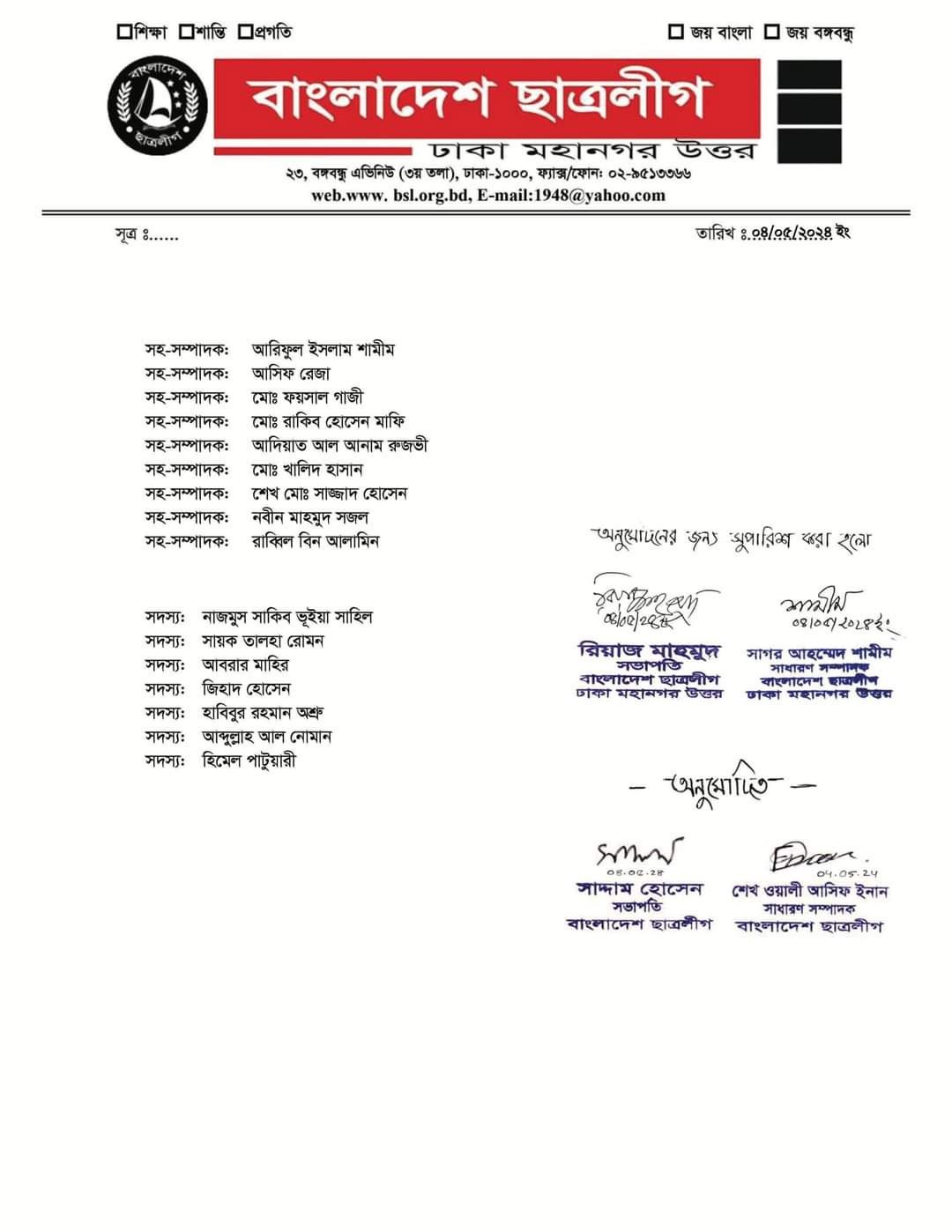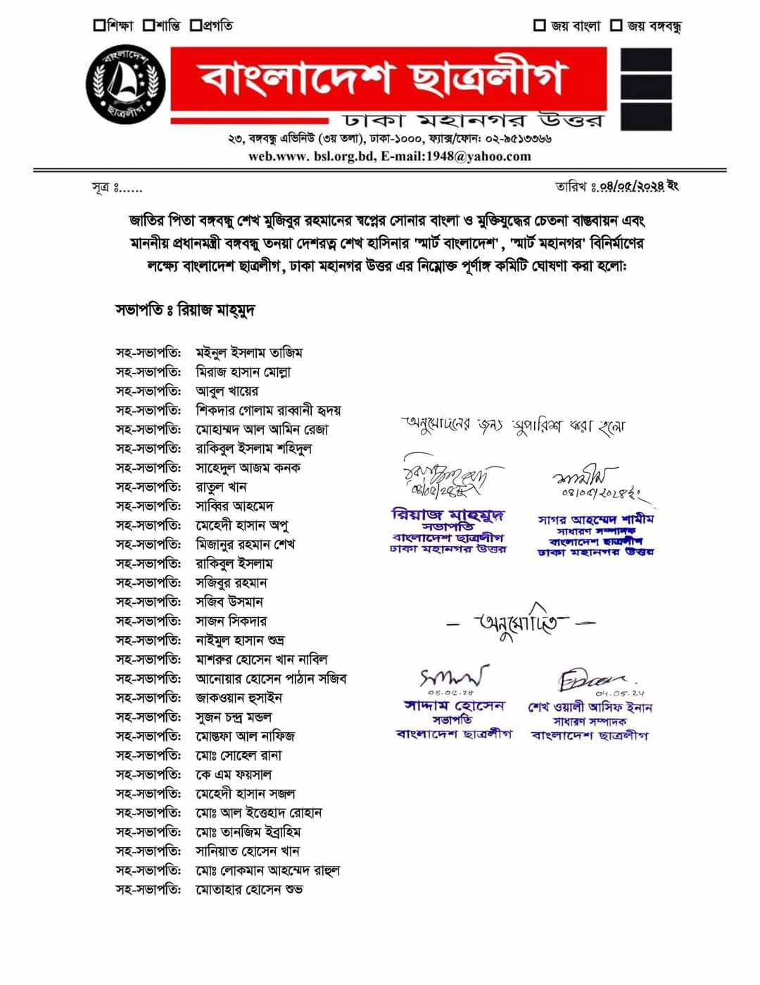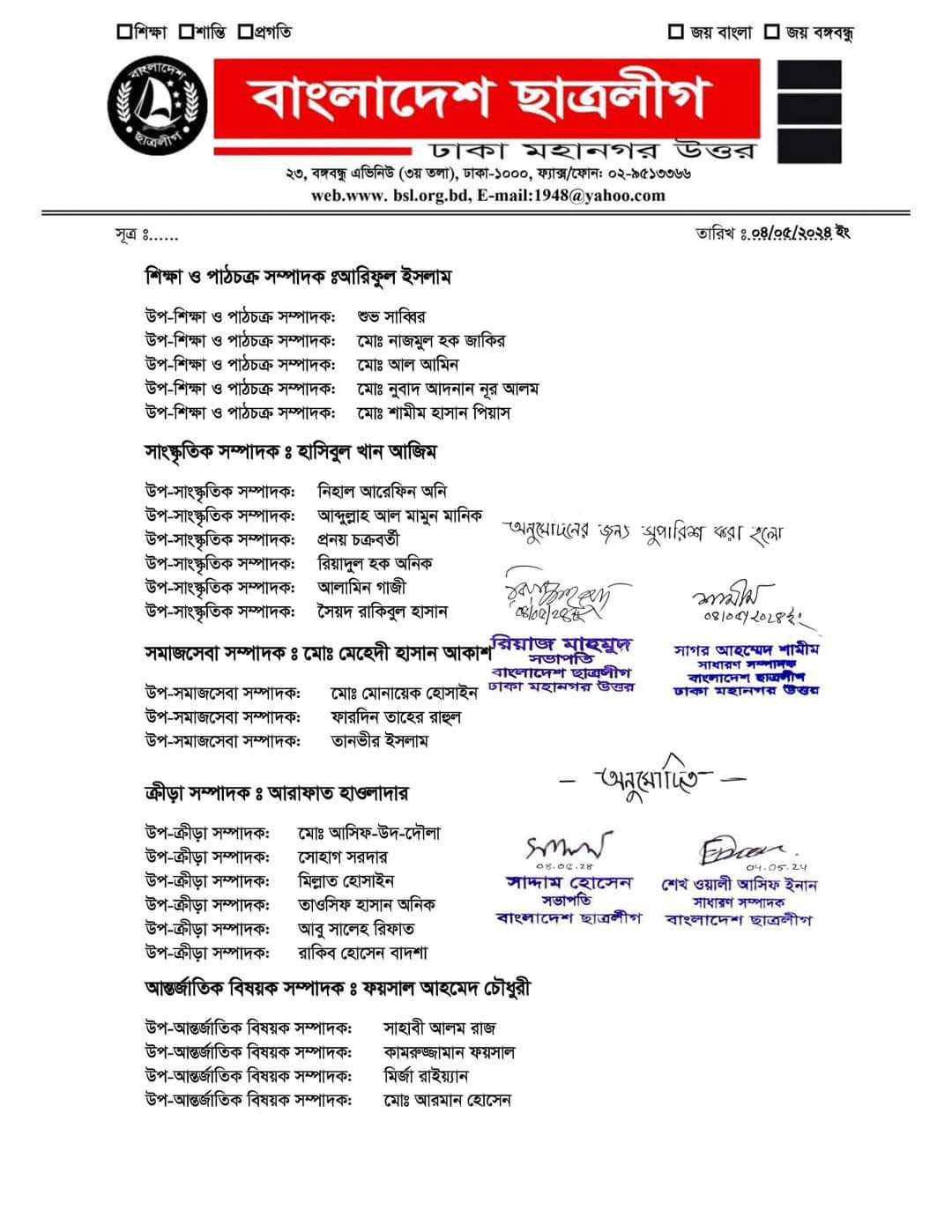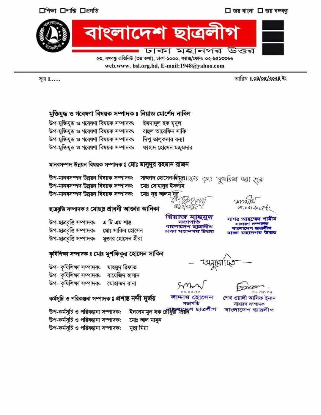 ঢাকা মহানগর উত্তর ছাত্রলীগের পূর্ণাঙ্গ কমিটি ঘোষণা