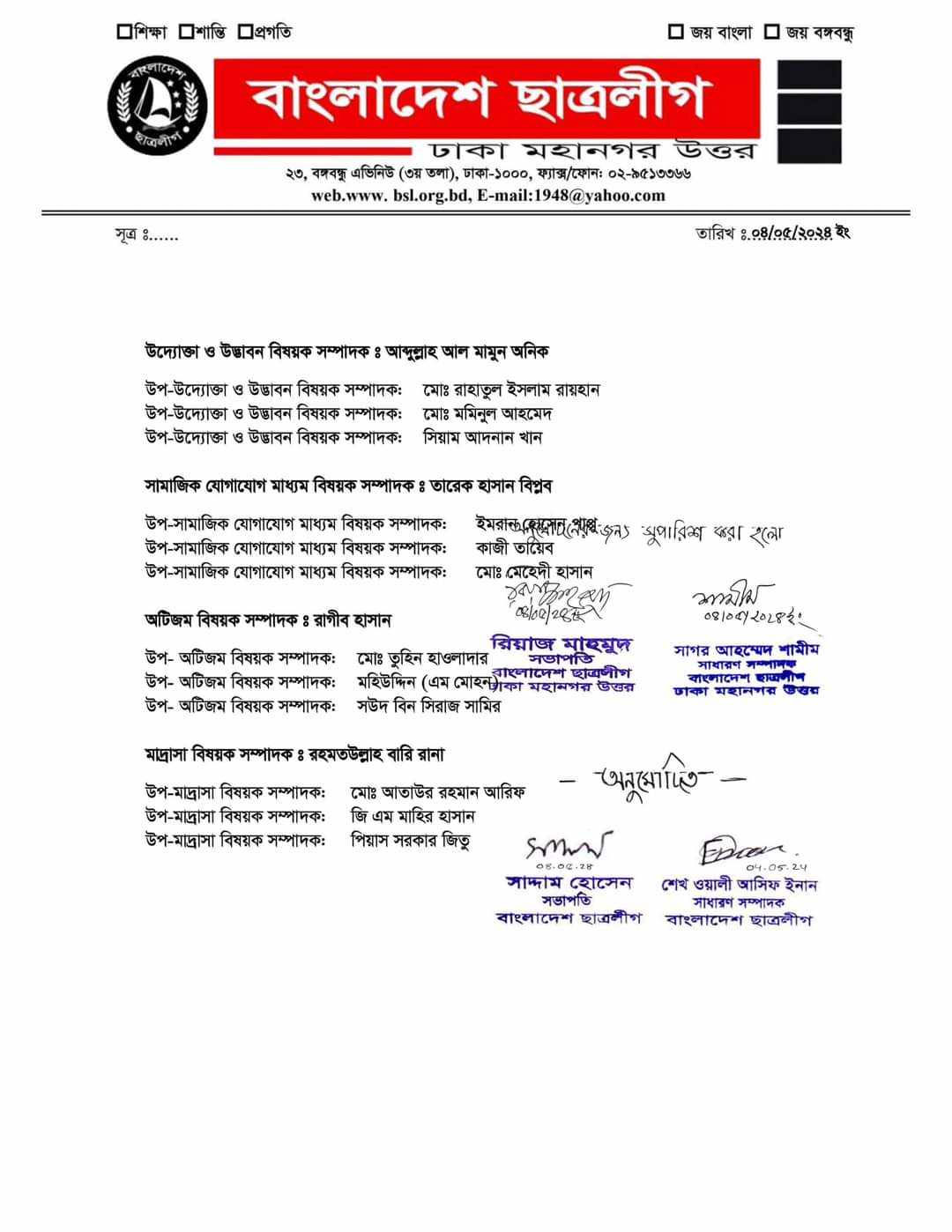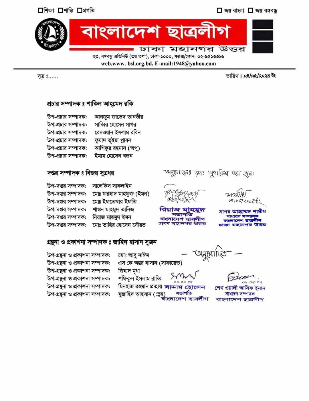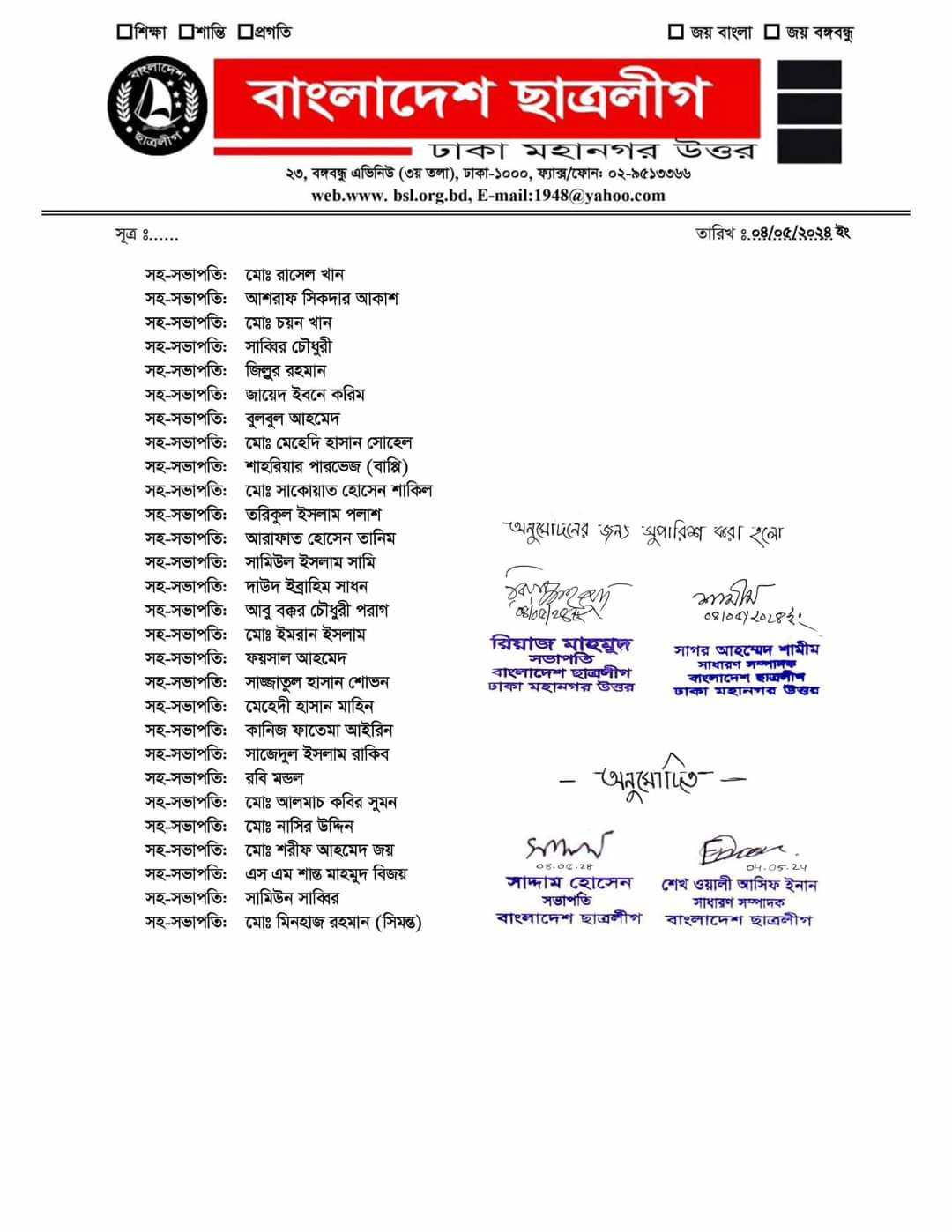 ঢাকা মহানগর উত্তর ছাত্রলীগের পূর্ণাঙ্গ কমিটি ঘোষণা