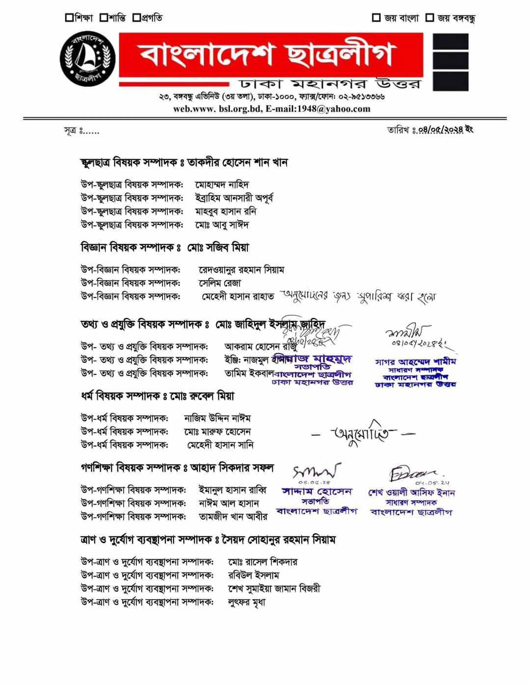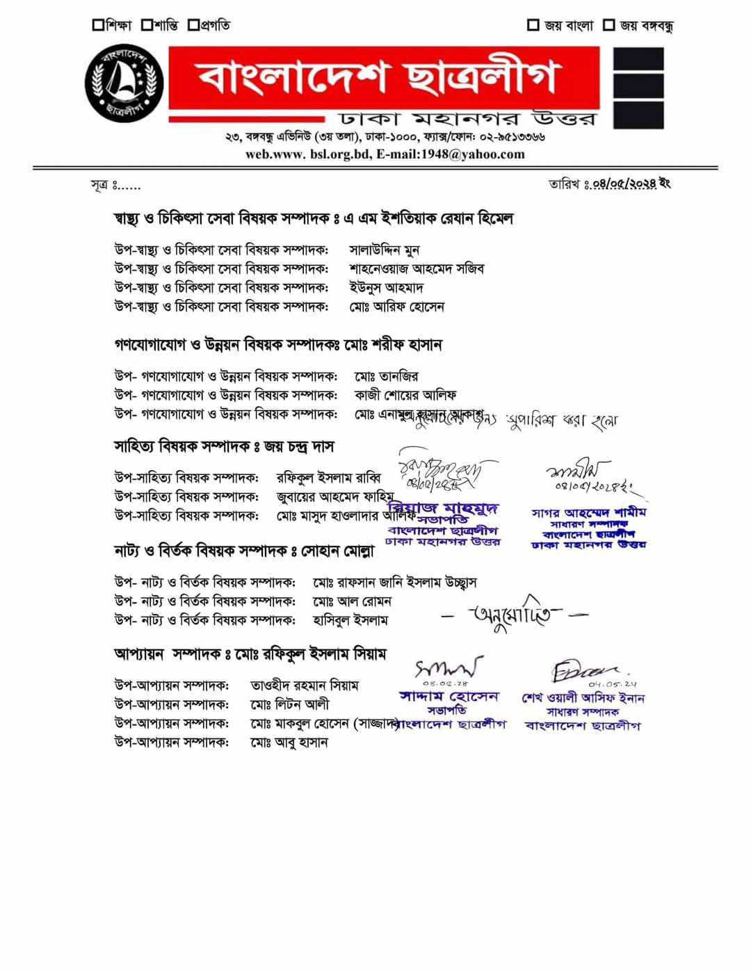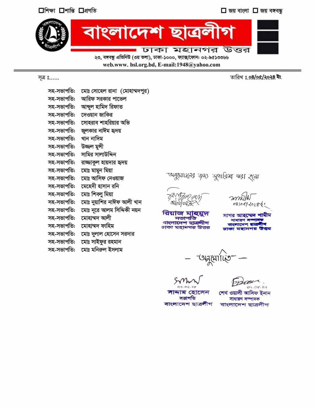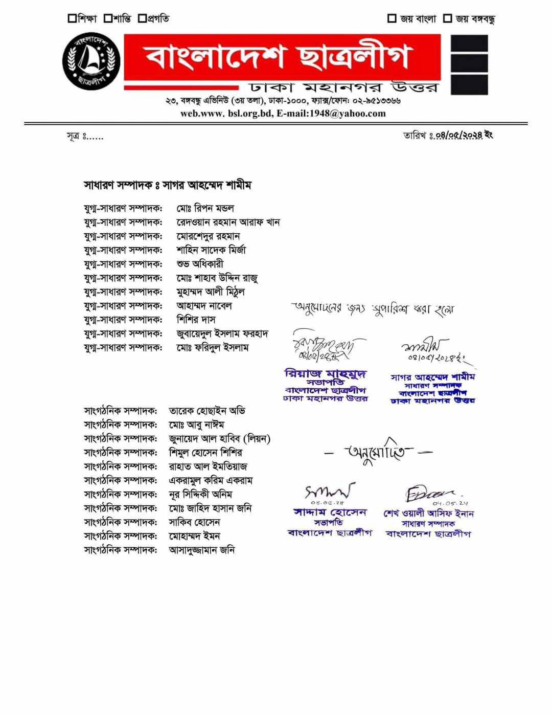 ঢাকা মহানগর উত্তর ছাত্রলীগের পূর্ণাঙ্গ কমিটি ঘোষণা