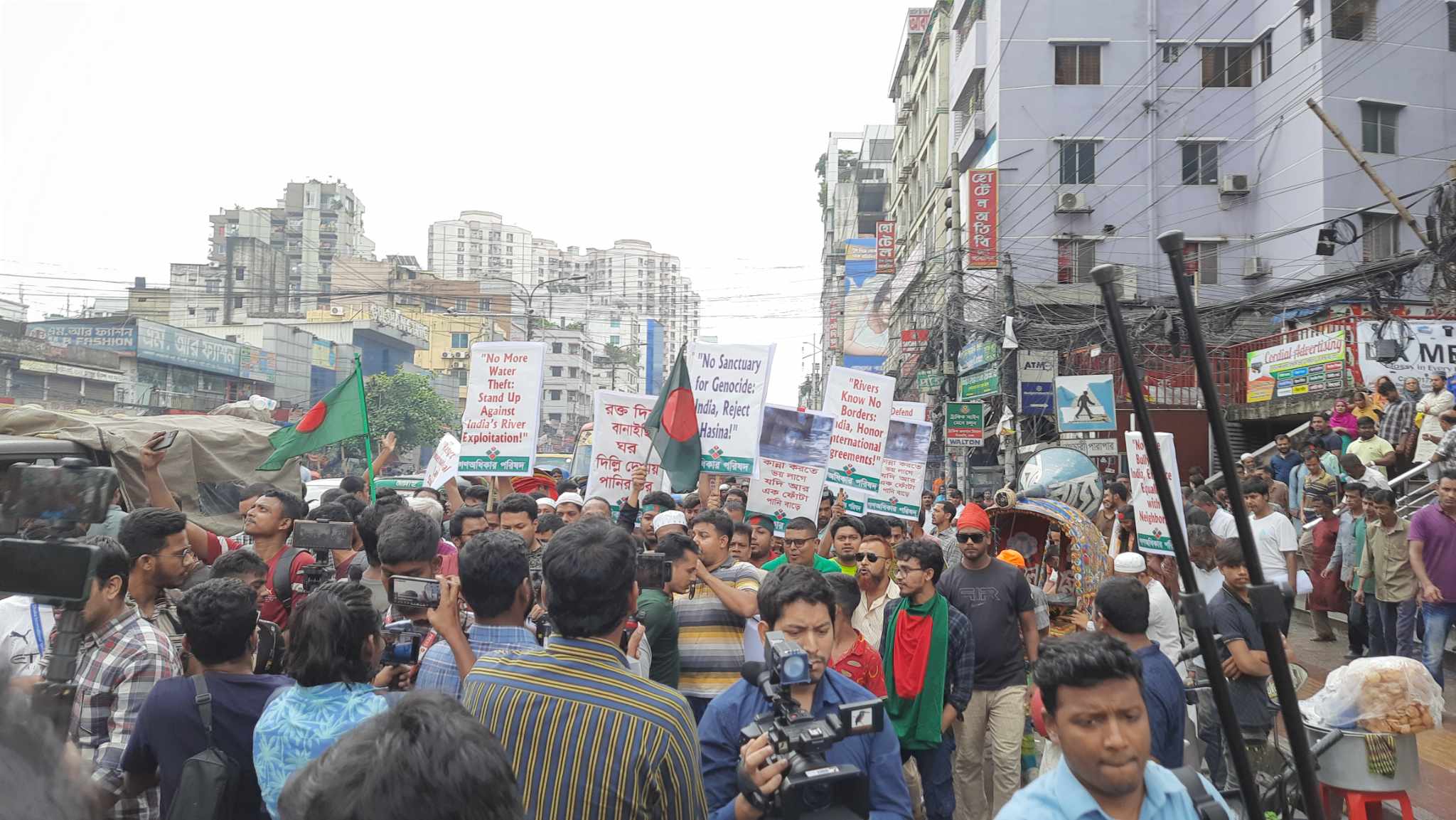 এসময় আন্দোলনকারীদের হাতে ভারতবিরোধী স্লোগান সম্বলিত নানা প্লে-কার্ড দেখা যায়। সেগুলোতে লেখা রয়েছে- রক্ত দিয়া বানাইছি ঘর দিল্লি দেখায় পানির ডর; ভারতীয় আগ্রাসন রুখে দাও; ফেনী-কুমিল্লা ডুবল কেন, ভারত তুই জবাব দে প্রভৃতি।