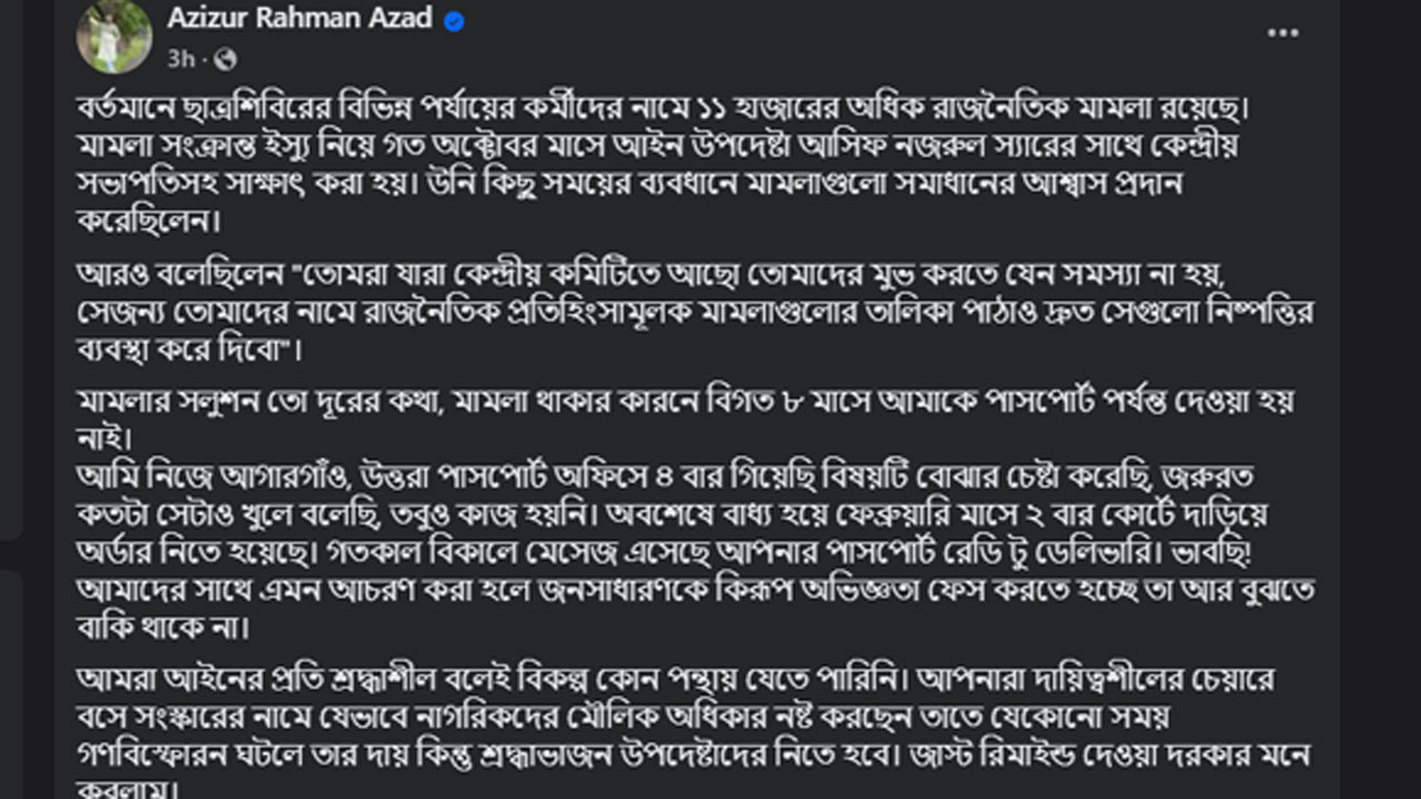 পোস্টে তিনি লেখেন, বর্তমানে ছাত্রশিবিরের বিভিন্ন পর্যায়ের কর্মীদের নামে ১১ হাজারের অধিক রাজনৈতিক মামলা রয়েছে। মামলা সংক্রান্ত ইস্যু নিয়ে গত অক্টোবর মাসে আইন উপদেষ্টা আসিফ নজরুল স্যারের সাথে কেন্দ্রীয় সভাপতিসহ সাক্ষাৎ করা হয়। উনি কিছু সময়ের ব্যবধানে মামলাগুলো সমাধানের আশ্বাস প্রদান করেছিলেন। আরও বলেছিলেন ‘তোমরা যারা কেন্দ্রীয় কমিটিতে আছো তোমাদের মুভ করতে যেন সমস্যা না হয়, সেজন্য তোমাদের নামে রাজনৈতিক প্রতিহিংসামূলক মামলাগুলোর তালিকা পাঠাও দ্রুত সেগুলো নিষ্পত্তির ব্যবস্থা করে দেবো।’