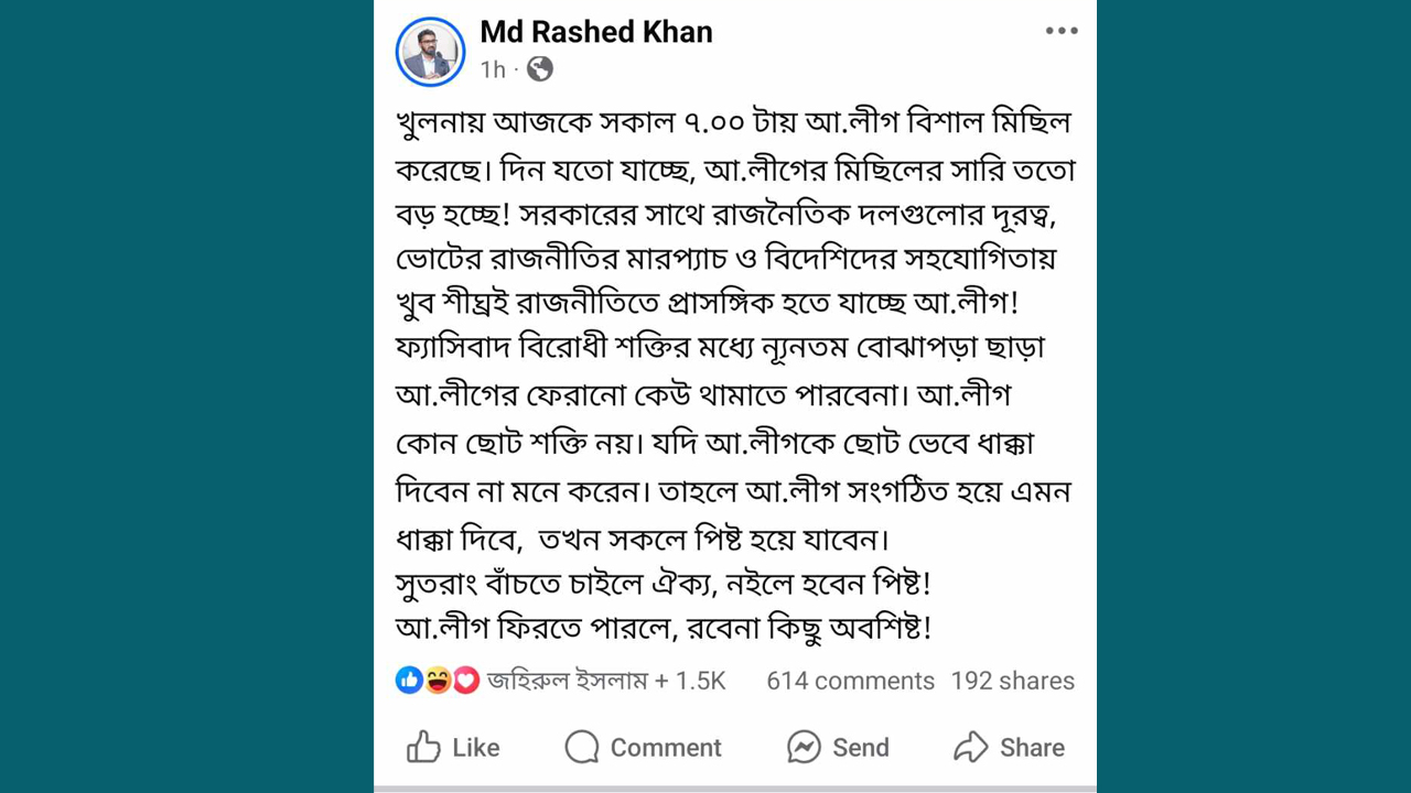 তিনি লেখেন, খুলনায় আজ সকাল ৭টায় আওয়ামী লীগ বিশাল মিছিল করেছে। দিন যত যাচ্ছে, আওয়ামী লীগের মিছিলের সারি ততই বড় হচ্ছে! সরকারের সঙ্গে রাজনৈতিক দলগুলোর দূরত্ব, ভোটের রাজনীতির মারপ্যাচ এবং বিদেশিদের সহযোগিতায় খুব শিগগিরই রাজনীতিতে প্রাসঙ্গিক হয়ে উঠতে যাচ্ছে আওয়ামী লীগ!