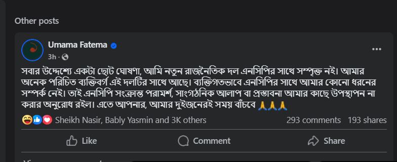 তিনি লিখেছেন, সবার উদ্দেশ্যে একটা ছোট ঘোষণা, আমি নতুন রাজনৈতিক দল এনসিপির সাথে সম্পৃক্ত নই। আমার অনেক পরিচিত ব্যক্তিবর্গ এই দলটির সাথে আছে। ব্যক্তিগতভাবে এনসিপির সাথে আমার কোনো ধরনের সম্পর্ক নেই। তাই এনসিপি সংক্রান্ত পরামর্শ, সাংগঠনিক আলাপ বা প্রস্তাবনা আমার কাছে উপস্থাপন না করার অনুরোধ রইল। এতে আপনার, আমার দুইজনেরই সময় বাঁচবে।