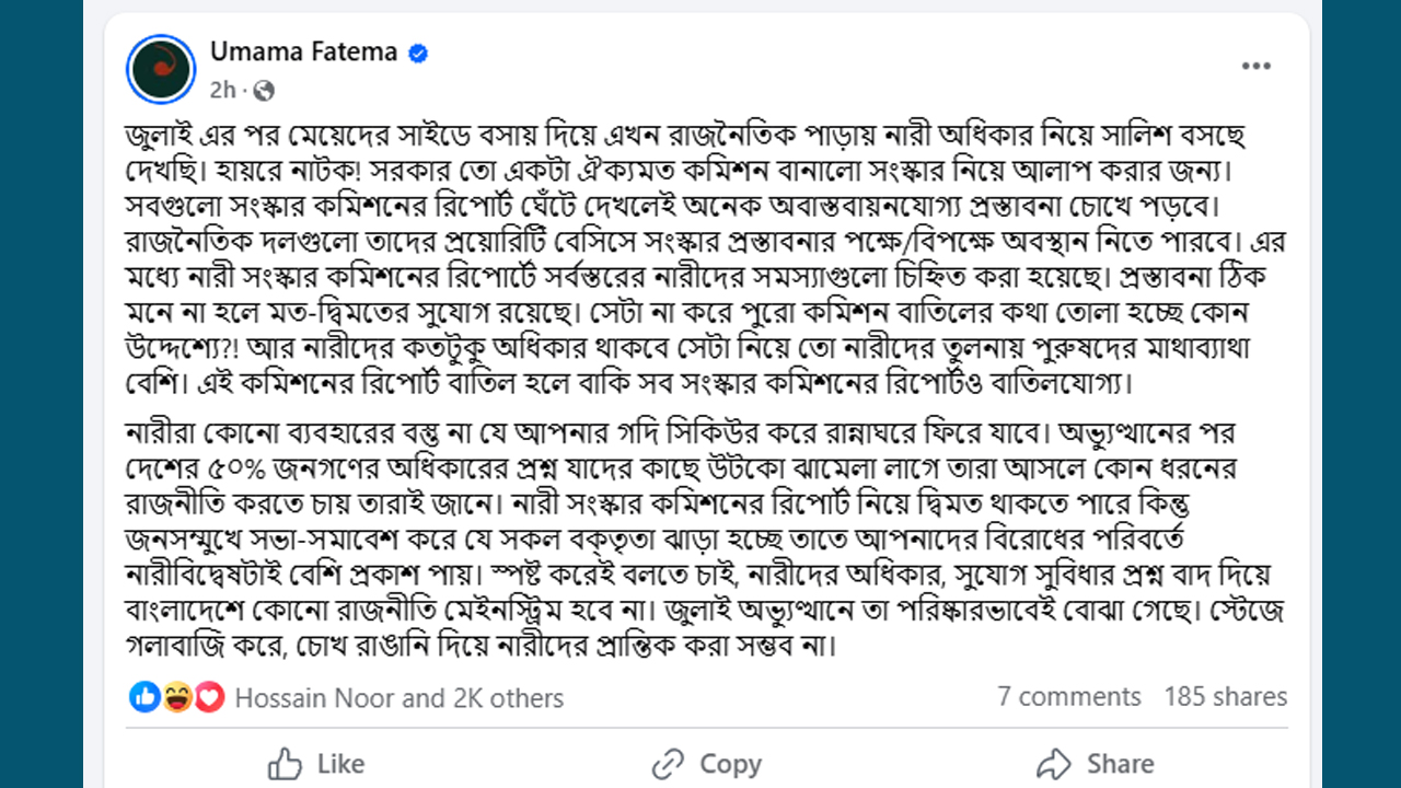 উমামা ফাতমা লিখেছেন, ‘জুলাই এর পর মেয়েদের সাইডে বসায় দিয়ে এখন রাজনৈতিক পাড়ায় নারী অধিকার নিয়ে সালিশ বসছে দেখছি। হায়রে নাটক! সরকার তো একটা ঐকমত্য কমিশন বানালো সংস্কার নিয়ে আলাপ করার জন্য। সবগুলো সংস্কার কমিশনের রিপোর্ট ঘেঁটে দেখলেই অনেক অবাস্তবায়নযোগ্য প্রস্তাবনা চোখে পড়বে। রাজনৈতিক দলগুলো তাদের প্রায়োরিটি বেসিসে সংস্কার প্রস্তাবনার পক্ষে/বিপক্ষে অবস্থান নিতে পারবে।’